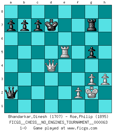 Last move : 1-0 2013 July 23 12:26:31 [Event "FICGS__CHESS__NO_ENGINES_TOURNAMENT__000063"] [Site "FICGS"] [Date "2013.06.11"] [Round "1"] [White "Bhandarkar,Dinesh"] [Black "Roe,Philip"] [Result "1-0"] [WhiteElo "1707"] [BlackElo "1895"] 1.e4 e5 2.Nf3 Nc6 3.Bc4 Nf6 4.d4 exd4 5.O-O Nxe4 6.Re1 d5 7.Bxd5 Qxd5 8.Nc3 Qa5 9.Nxe4 Be6 10.Neg5 O-O-O 11.Nxe6 fxe6 12.Rxe6 Bd6 13.Bg5 Rde8 14.Qe2 Kd7 15.Rxe8 Rxe8 16.Qd3 h6 17.Bd2 Qh5 18.h3 Ne5 19.Nxe5+ Qxe5 20.g3 Rf8 21.c3 dxc3 22.Bxc3 Qh5 23.Kg2 Qf7 24.Qe2 h5 25.Re1 g5 26.b4 Qd5+ 27.Kg1 Qf5 28.Bg7 Rg8 29.Qxh5 Bxb4 30.Re5 Qb1+ 31.Kg2 Qxa2 32.Qg4+ Kc6 33.Qxb4 Rxg7 34.Qc5+ Kd7 35.Qd4+ 1-0 Two knights defense Kingside Castling by player White (move 5) Queenside Castling by player Black (move 10) Player White won this chess game. Follow this game move after move (download)Chess, like any creative activity, can exist only through the combined efforts of those who have creative talent, and those who have the ability to organize their creative work. (Mikhail Botvinnik) Wenn ein Kopf und ein Buch zusammenstoßen und es klingt hohl, ist es denn allemal im Buche? (Georg Christoph Lichtenberg) Al jugar al Ajedrez entonces, podemos aprender: Primero: Previsión... Segundo: Prudencia... Tercero: Cautela... Y al final, aprendemos del Ajedrez el hábito de no ser desanimados por apariencias malas presentes en el estado de nuestros asuntos, el hábito de la esperanza por una oportunidad favorable y la perseveración de los secretos de los recursos. (Benjamin Franklin) La guerre est enfant de la passion, la passion est enfant du narcissisme et le narcissisme est l'enfant. (...) Une autre partie ? (Thibault de Vassal) Once you start thinking you have nothing left to learn, you have everything to learn. (Steve Badget)