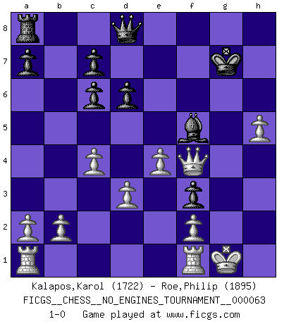 Last move : 1-0 2013 July 18 10:29:43 [Event "FICGS__CHESS__NO_ENGINES_TOURNAMENT__000063"] [Site "FICGS"] [Date "2013.06.11"] [Round "1"] [White "Kalapos,Karol"] [Black "Roe,Philip"] [Result "1-0"] [WhiteElo "1722"] [BlackElo "1895"] 1.Nf3 d6 2.g3 e5 3.d3 f5 4.c4 g6 5.Bg2 Bh6 6.Nc3 Nc6 7.O-O f4 8.gxf4 exf4 9.Nd5 g5 10.h4 g4 11.Ng5 Nge7 12.Nf6+ Kf8 13.Bxf4 Ng6 14.Ngxh7+ Kg7 15.Bxh6+ Kxh6 16.h5 Rxh7 17.Qd2+ Kg7 18.Nxh7 Nh4 19.Bxc6 bxc6 20.Ng5 Bf5 21.e4 Nf3+ 22.Nxf3 gxf3 23.Qf4 1-0 Reti Opening Kingside Castling by player White (move 7) Player White won this chess game. Follow this game move after move (download)A thorough understanding of the typical mating continuations makes the most complicated sacrificial combinations leading up to them not only not difficult, but almost a matter of course. (Siegbert Tarrasch) Ein Teil des Fehlers ist immer korrekt. (Savielly Grigorievitsch Tartakower) El Ajedrez te enseña a controlarl la excitación inicial que sientes cuando vez algo que parece bueno y te enseña a pensar objetivamente cuando te encuentras en problemas. (Stanley Kubrick) Seul un grand joueur sait à quel point il joue faiblement. (Xavier Tartacover) We need strong personalities and only one world champion to attract sponsors. (Anatoly Karpov)
