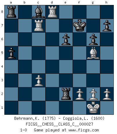 Last move : 1-0 2007 April 9 18:43:24 [Event "FICGS__CHESS__CLASS_C__000027"] [Site "FICGS"] [Date "2007.02.01"] [Round "1"] [White "Behrmann,Klaus"] [Black "Coggiola,Leandro Damian"] [Result "1-0"] [WhiteElo "1775"] [BlackElo "1600"] 1.e4 c5 2.Nf3 d6 3.d4 cxd4 4.c3 Nf6 5.Qxd4 Nc6 6.Qd3 g6 7.Be2 Bg7 8.O-O O-O 9.Rd1 Qc7 10.Na3 a6 11.Nc4 b5 12.Ne3 Bb7 13.Nd5 Nxd5 14.exd5 Ne5 15.Nxe5 Bxe5 16.a4 bxa4 17.Qc4 Qd7 18.Qxa4 Qxa4 19.Rxa4 Rfb8 20.Bg5 Kf8 21.Ra5 Bc8 22.Bh6+ Ke8 23.Rd2 Kd7 24.Be3 e6 25.dxe6+ fxe6 26.Rxe5 Ke7 27.Bg5+ Kf7 28.Rxd6 Rxb2 29.Rd8 a5 30.Rc5 Rxe2 31.Rc7+ 1-0 Sicilian Kingside Castling by player White (move 8) Kingside Castling by player Black (move 8) Player White won this chess game. Follow this game move after move (download)Chess is the art of analysis. (Mikhail Botvinnik) Sitze auf Deine Hände. (Siegbert Tarrasch) Cuando tengo las piezas blancas, yo gano porque soy blanco; Cuando tengo las piezas negras, yo gano porque soy Bogolyubov. (Bogolyubov) La guerre est enfant de la passion, la passion est enfant du narcissisme et le narcissisme est l'enfant. (...) Une autre partie ? (Thibault de Vassal) Bobby never cared about money, though. His only desire was to prove that his choices were correct: He wanted chess to be important because he was a chess player, and he wanted to be important. Bobby knew money was important, but he didn't have a clue why, outside of clothes and status. The only way he could accomplish what he wanted was to fight for a lot of money. Once he got it, he gave it away. He did not know how to spend it. And once he'd become champion, after, essentially, sacrificing his life for it, he didn't know how to spend his time. (Bob Wade)