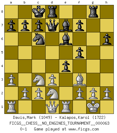 Last move : 0-1 2013 September 5 13:19:38 [Event "FICGS__CHESS__NO_ENGINES_TOURNAMENT__000063"] [Site "FICGS"] [Date "2013.06.11"] [Round "1"] [White "Davis,Mark"] [Black "Kalapos,Karol"] [Result "0-1"] [WhiteElo "1049"] [BlackElo "1722"] 1.e4 d5 2.exd5 Qxd5 3.Nf3 Bg4 4.Be2 Nc6 5.Nc3 Qd7 6.O-O Nf6 7.d3 e5 8.Bg5 O-O-O 9.a3 h6 10.Bh4 Bd6 11.Bxf6 gxf6 12.Re1 Rhg8 13.Ne4 Be7 14.Nfd2 Be6 15.Bf3 f5 16.Nc3 e4 0-1 This chess game has been lost on time (started : 2013.06.11 6:52:43) Scandinavian (centre counter) defense Kingside Castling by player White (move 6) Queenside Castling by player Black (move 8) Player Black won this chess game. Follow this game move after move (download)I'm not a materialistic person, in that, I don't suffer the lack or loss of money. The absence of worldly goods I don't look back on. For Chess is a way I can be as materialistic as I want without having to sell my soul. (Jamie Walter Adams) Ich brauche nur einen Blick auf das Schachbrett zu werfen, und weiß schon, was in der Stellung steckt, was geschehen kann und was geschehen wird. Alle übrigen suchen und prüfen, ich aber weiß es! (José Raúl Capablanca) Morphy probablemente fue el genio más grande de todos. (Bobby Fischer) Le temps de noter son nom sur la feuille de partie, j'étais déjà en zeitnot ! D'un modeste amateur apparié lors de la première ronde d'un open contre le grand-maître Azmaïparashvili. Establishing goals is all right if you don't let them deprive you of interesting detours. (Doug Larson)