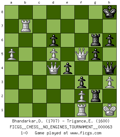 Last move : 1-0 2013 July 21 16:40:50 [Event "FICGS__CHESS__NO_ENGINES_TOURNAMENT__000063"] [Site "FICGS"] [Date "2013.06.11"] [Round "1"] [White "Bhandarkar,Dinesh"] [Black "Trigance,Emile"] [Result "1-0"] [WhiteElo "1707"] [BlackElo "1600"] 1.e4 c5 2.Nf3 Nc6 3.d4 cxd4 4.Nxd4 Nf6 5.Nc3 e5 6.Ndb5 d6 7.Bg5 a6 8.Na3 b5 9.Nd5 Qa5+ 10.Bd2 Qd8 11.Bd3 Nxd5 12.exd5 Ne7 13.c4 g6 14.O-O Bg7 15.cxb5 O-O 16.bxa6 Bxa6 17.Bxa6 Rxa6 18.Bg5 h6 19.Bxe7 Qxe7 20.Nc4 f5 21.Qe2 Ra7 22.a4 e4 23.a5 Rc8 24.Rab1 Rb8 25.b4 Bc3 26.Nb6 Bd4 27.Na4 Qd7 28.Qa2 f4 29.Qd2 Be5 30.Nb6 Qg4 31.h3 Qh4 32.Nc4 Re8 33.b5 f3 34.b6 Rf7 35.Nxe5 Rxe5 36.b7 Rg5 37.b8Q+ Kh7 38.Qc8 Rxg2+ 39.Kh1 g5 40.Rb8 Rg7 41.Qf5+ Rg6 42.Rb7+ Kh8 43.Qd4+ 1-0 Sicilian : Pelikan (Lasker/Sveshnikov) variation Kingside Castling by player White (move 14) Kingside Castling by player Black (move 15) Promotion Queen by player White (move 37) Player White won this chess game. Follow this game move after move (download)Chess books should be used as we use glasses: to assist the sight, although some players make use of them as if they thought they conferred sight. (Jose Raul Capablanca) Wie bekannt hörte Morphy 1859 auf, Schach zu spielen. Seine Enttäuschung galt nicht so sehr dem Schach, wie den Schachspielern. (Robert James Fischer) Debemos de asegurarnos de que el Ajedrez no se convierta en un lenguaje muerto, muy interesante, pero tan solo para un grupo muy pequeño. (Sytze Faber) Les Echecs sont et restent toujours un combat, un combat intégral comme la boxe, la lutte ou un autre sport, et où il doit y avoir un vainqueur et un vaincu. (Joseph Emil Diemer) Empty your mind, be formless, shapeless — like water. (Bruce Lee)