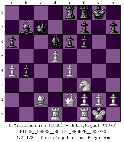 Last move : 1/2-1/2 2013 June 12 14:25:8 [Event "FICGS__CHESS__BULLET_BRONZE__000790"] [Site "FICGS"] [Date "2013.06.12"] [Round "1"] [White "Ortiz,Clodomiro"] [Black "Ortiz,Miguel"] [Result "1/2-1/2"] [WhiteElo "2038"] [BlackElo "1978"] 1.d4 d5 2.c4 c6 3.Nc3 Nf6 4.Nf3 e6 5.e3 Nbd7 6.Bd3 dxc4 7.Bxc4 b5 8.Bd3 Bb7 9.O-O a6 10.e4 c5 11.d5 Qc7 12.Bc2 c4 13.Qe2 Bd6 14.Bg5 O-O 15.Bxf6 gxf6 16.Rad1 Nc5 17.b4 cxb3 18.axb3 b4 19.Na4 Nxa4 20.bxa4 Rae8 1/2-1/2 QGD Slav defense Kingside Castling by player White (move 9) Kingside Castling by player Black (move 14) This chess game ended in a draw. Follow this game move after move (download)Pawn endings are to Chess what putting is to golf. (Cecil Purdy) Ohne Fehler kann es keine Brillanz geben. (Emanuel Lasker) Uno por uno, yo los acribillé, mi superioridad muy pronto se volvio aparente. (Jose Capablanca) Mais l'homme est une créature légère et illogique : semblable au joueur d'échecs, il n'aime que le processus du but à atteindre, non le but lui-même. (Dostoïevsky) It is not true that people stop pursuing dreams because they grow old, they grow old because they stop pursuing dreams. (Gabriel Garcia Marquez)