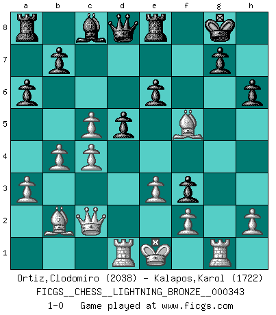 Last move : 1-0 2013 June 12 14:57:44 [Event "FICGS__CHESS__LIGHTNING_BRONZE__000343"] [Site "FICGS"] [Date "2013.06.12"] [Round "1"] [White "Ortiz,Clodomiro"] [Black "Kalapos,Karol"] [Result "1-0"] [WhiteElo "2038"] [BlackElo "1722"] 1.d4 Nf6 2.c4 e6 3.Nc3 Bb4 4.e3 d5 5.Nf3 h6 6.Bd2 c5 7.a3 Bxc3 8.Bxc3 Nc6 9.dxc5 O-O 10.b4 Ne4 11.Bb2 a6 12.Qc2 Re8 13.Rd1 Ne7 14.Bd3 f5 15.g4 fxg4 16.Bxe4 gxf3 17.Rg1 Nf5 18.Bxf5 1-0 Nimzo-Indian : 4.e3 Kingside Castling by player Black (move 9) Player White won this chess game. Follow this game move after move (download)The older I grow, the more I value pawns. (Paul Keres) Auf jeden Fall musst du zuerst Rechtsanwalt werden, damit du deine eigenen Interessen und die deiner Familie vertreten kannst. [Brief an seinen Sohn] (José Raúl Capablanca) Si el ingenio solamente fuese necesario para lucirse, las mujeres serían las mejores jugadoras de Ajedrez del mundo. (Albin) La victoire dans une partie d'Echecs appartient la plupart du temps à celui qui voit un peu plus loin que l'adversaire. (Lasker) Always two there are. No more no less. A master, and an apprentice. (Master Yoda in Star Wars ep.1)