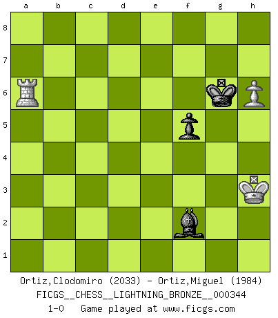 Last move : 1-0 2013 June 12 16:32:40 [Event "FICGS__CHESS__LIGHTNING_BRONZE__000344"] [Site "FICGS"] [Date "2013.06.12"] [Round "1"] [White "Ortiz,Clodomiro"] [Black "Ortiz,Miguel"] [Result "1-0"] [WhiteElo "2033"] [BlackElo "1984"] 1.e4 c5 2.Nf3 d6 3.d4 cxd4 4.Nxd4 Nf6 5.Nc3 a6 6.Be3 e5 7.Nb3 Be6 8.f3 h5 9.Be2 Nbd7 10.O-O b5 11.Nc1 Be7 12.Nd3 O-O 13.a4 bxa4 14.Nb4 Qc8 15.Ncd5 Bxd5 16.exd5 Bd8 17.Nc6 Qb7 18.Rxa4 Nb6 19.Bxb6 Qxb6+ 20.Kh1 Qxb2 21.Rb4 Qa2 22.Rb3 a5 23.Qc1 Rc8 24.Ba6 Rc7 25.Bb5 Nh7 26.Bd3 Qa4 27.f4 Rxc6 28.Ra3 Rxc2 29.Bxc2 Qb4 30.fxe5 dxe5 31.Rb3 Qe7 32.Qd2 Qd6 33.Qd3 g6 34.Qc4 e4 35.Bxe4 Bc7 36.g3 h4 37.Bg2 hxg3 38.Rxg3 Nf6 39.Qh4 Nh5 40.Rc3 Qe5 41.Rc6 Re8 42.Rc4 Qd6 43.Qh3 Rd8 44.Bf3 Nf4 45.Qg3 Bb8 46.Bg2 Nh5 47.Qxd6 Bxd6 48.Ra1 Bb4 49.Rac1 Kg7 50.Bf3 Kf6 51.Rh4 Rd7 52.Bxh5 gxh5 53.Rxh5 Kg6 54.Re5 Kf6 55.Re4 Rxd5 56.Rf1+ Rf5 57.Rxf5+ Kxf5 58.Rc4 Kg5 59.h4+ Kh5 60.Kg2 Bd6 61.Kh3 Be7 62.Rc8 Bb4 63.Rc7 f6 64.Rc8 Kg6 65.Rc2 Bf8 66.Ra2 Bb4 67.Kg4 f5+ 68.Kh3 Kh5 69.Rg2 Be7 70.Rg8 Kh6 71.Re8 Bf6 72.Re6 Kg6 73.h5+ Kf7 74.Rc6 Bd4 75.Kg3 a4 76.Ra6 Be5+ 77.Kh4 Bf6+ 78.Kh3 Bd4 79.h6 Bf2 80.Rxa4 Kg6 81.Ra6+ 1-0 Sicilian : Najdorf, Byrne (English) attack Kingside Castling by player White (move 10) Kingside Castling by player Black (move 12) 10 pieces endgame at move 53 : White KRRPP , Black KRBPP WHITE : King + 2 Rooks 2 Pawns BLACK : King + 1 Rook 1 Bishop 2 Pawns 9 pieces endgame at move 55 : White KRRP , Black KRBPP WHITE : King + 2 Rooks 1 Pawn BLACK : King + 1 Rook 1 Bishop 2 Pawns 8 pieces endgame at move 57 : White KRRP , Black KBPP WHITE : King + 2 Rooks 1 Pawn BLACK : King + 1 Bishop 2 Pawns 7 pieces endgame at move 57 : White KRP , Black KBPP WHITE : King + 1 Rook 1 Pawn BLACK : King + 1 Bishop 2 Pawns 6 pieces endgame at move 80 : White KRP , Black KBP WHITE : King + 1 Rook 1 Pawn BLACK : King + 1 Bishop 1 Pawn Player White won this chess game. Follow this game move after move (download)Fischer sacrificed virtually everything most of us weakies (to use his term) value, respect, and cherish, for the sake of an artful, often beautiful board game, for the ambivalent privilege of being its greatest master. (Paul Kollar) Mit sehr nachdenklichem Gesicht schreitet Bobby durch den Turniersaal. Was ist passiert?, fragt Lombardy. Ich stehe schlecht, antwortet Fischer. Lombardy: Dann biete doch einfach Remis an. Fischer: So schlecht stehe ich nun auch wieder nicht! (Robert James Fischer) Tu sabes que vas a perder. Aún cuando tenía la ventaja, yo sabía que iba a perder. - al estar jugando con Fischer (Andrew Soltis) Je menace de comprendre la position. (Anonyme) The intuitive mind is a sacred gift; the rational mind is a faithful servant. We have created a society that honors the servant but has forgotten the gift. (Albert Einstein)