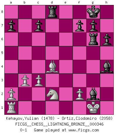 Last move : 0-1 2013 June 12 20:2:11 [Event "FICGS__CHESS__LIGHTNING_BRONZE__000346"] [Site "FICGS"] [Date "2013.06.12"] [Round "1"] [White "Kehayov,Yulian"] [Black "Ortiz,Clodomiro"] [Result "0-1"] [WhiteElo "1478"] [BlackElo "2058"] 1.e4 e5 2.Nf3 Nc6 3.d4 exd4 4.Nxd4 Nf6 5.Nxc6 bxc6 6.Bd3 d5 7.exd5 cxd5 8.h3 Be7 9.O-O O-O 10.Bg5 Rb8 11.b3 h6 12.Bd2 Ne4 13.Bxe4 dxe4 14.Bc3 Rb6 15.Re1 Qxd1 16.Rxd1 Rg6 17.Re1 Bxh3 18.Rxe4 Bc5 19.Bd4 Rd8 20.c3 Bxg2 21.Rh4 Be7 22.Nd2 Bxh4 0-1 Scotch : Schmidt variation Kingside Castling by player White (move 9) Kingside Castling by player Black (move 9) Player Black won this chess game. Follow this game move after move (download)Adequate compensation for a sacrifice is having a sound combination leading to a winning position; adequate compensation for a blunder is having your opponent snatch defeat from the jaws of victory. (Bruce A. Moon) Schach ist gnadenlos. Du mußt bereit sein zu töten. (Nigel Short) Después de la respuesta de las negras a 1.e4 con 1..e5, se quedan siempre tratando de entrar dentro del juego. (Howard Staunton) Vous n'êtes pas toujours obligé de jouer le meilleur coup. Un coup doit être actif, entreprenant, correct et beau ! (David Bronstein) Wawaweewa ! (Borat: Cultural learnings of America for make benefit glorious nation of Kazakhstan)