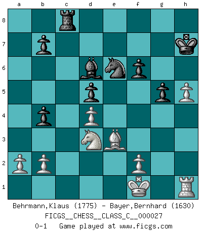 Last move : 0-1 2007 July 11 22:29:14 [Event "FICGS__CHESS__CLASS_C__000027"] [Site "FICGS"] [Date "2007.02.01"] [Round "1"] [White "Behrmann,Klaus"] [Black "Bayer,Bernhard"] [Result "0-1"] [WhiteElo "1775"] [BlackElo "1630"] 1.Nf3 Nf6 2.g3 d5 3.Bg2 c6 4.O-O Bg4 5.d4 Nbd7 6.Nbd2 e6 7.h3 Bh5 8.Re1 Be7 9.c4 O-O 10.Qb3 Qb6 11.Qxb6 axb6 12.e4 Bb4 13.exd5 exd5 14.g4 Bg6 15.g5 Nh5 16.cxd5 cxd5 17.Nh4 Nf4 18.Nxg6 hxg6 19.Rd1 Nxg2 20.Kxg2 b5 21.Nb3 Rfc8 22.Be3 Bd6 23.Rac1 Rxc1 24.Nxc1 b4 25.Re1 Nf8 26.h4 Ne6 27.Rh1 f5 28.gxf6 gxf6 29.h5 g5 30.Kf1 Rc8 31.Nd3 Kh7 0-1 Reti Opening Kingside Castling by player White (move 4) Kingside Castling by player Black (move 9) Player Black won this chess game. Follow this game move after move (download)A thorough understanding of the typical mating continuations makes the most complicated sacrificial combinations leading up to them not only not difficult, but almost a matter of course. (Siegbert Tarrasch) Ein Großmeister muß tausende Partien in seinem Kopf speichern, denn diese sind für Ihn, was die Worte der Muttersprache für gewöhnliche Leute sind, oder Noten für Musiker... (Garry Kasparov) Aún el Rey más flojo huye despavorido ante la amenaza de un Jaque doble. (Aaron Nimzowitsch) Donnez-moi un Cavalier en 6e et je gagnerais toutes mes parties. (Steinitz) Hold em is to stud what chess is to checkers. (Johnny Moss)