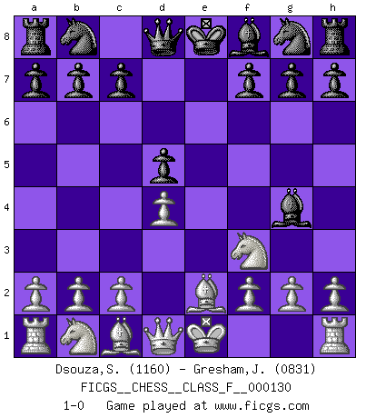 Last move : 1-0 2013 August 16 18:10:15 [Event "FICGS__CHESS__CLASS_F__000130"] [Site "FICGS"] [Date "2013.06.13"] [Round "1"] [White "Dsouza,Stanislaus"] [Black "Gresham,Jonathan"] [Result "1-0"] [WhiteElo "1160"] [BlackElo "0831"] 1.e4 e6 2.d4 d5 3.exd5 exd5 4.Nf3 Bg4 5.Be2 1-0 This chess game has been lost on time (started : 2013.06.13 0:46:42) French : Exchange variation Player White won this chess game. Follow this game move after move (download)Different people feel differently about resigning. (Bobby Fischer) Ich habe die Schachforschung dermaßen betrieben, dass sie auf eine wissenschaftliche Basis gestellt wurde. (Mikhail Moiseyevich Botvinik) El ganador de una partida es aquel jugador que hace el penúltimo error. (Savielly Tartakover) L'ordinateur a tué l'originalité. Il n'y a plus guère d'aventures sur l'échiquier. (Jacob Murray) The good fighters of old first put themselves beyond the possibility of defeat, and then waited for an opportunity of defeating the enemy. (Sun Tzu)