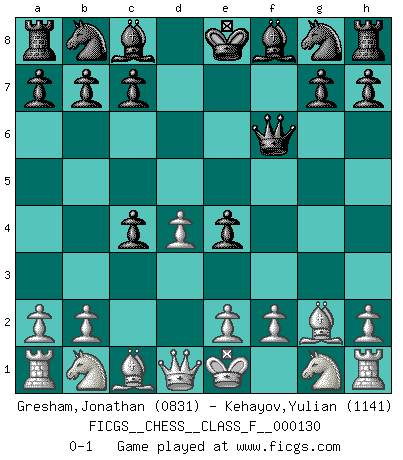 Last move : 0-1 2013 July 27 16:17:6 [Event "FICGS__CHESS__CLASS_F__000130"] [Site "FICGS"] [Date "2013.06.13"] [Round "1"] [White "Gresham,Jonathan"] [Black "Kehayov,Yulian"] [Result "0-1"] [WhiteElo "0831"] [BlackElo "1141"] 1.g4 e5 2.Bg2 d5 3.d4 e4 4.g5 f6 5.gxf6 Qxf6 6.c4 dxc4 0-1 This chess game has been lost on time (started : 2013.06.13 0:46:42) Grob's attack Player Black won this chess game. Follow this game move after move (download)Becoming successful at Chess allows you to discover your own personality. That's what I want for the kids I teach. (Saudin Robovic) Ein Isolani verdüstert die Stimmung auf dem ganzen Schachbrett. (Savielly Grigorievitsch Tartakower) El Ajedrez es el juego mas altamente simbólico, pero las agresiones estan por lo tanto aún mas francamente representadas en la partida. Tal vez comenzo como un juego de guerra; Algo como la representación de una batalla en miniatura entre las fuerzas de dos reinos. (Karl Meninger) Il vaut toujours mieux jouer un plan faux de façon logique que de n'avoir pas de plan du tout. (Victor Kortchnoï) Humor is by far the most significant activity of the human brain. (Edward De Bono)