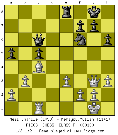 Last move : 1/2-1/2 2013 July 21 19:36:35 [Event "FICGS__CHESS__CLASS_F__000130"] [Site "FICGS"] [Date "2013.06.13"] [Round "1"] [White "Neil,Charlie"] [Black "Kehayov,Yulian"] [Result "1/2-1/2"] [WhiteElo "1053"] [BlackElo "1141"] 1.d4 d5 2.Nf3 Nc6 3.Bf4 e6 4.h3 h6 5.e3 Nf6 6.Bd3 Bd6 7.Bxd6 Qxd6 8.c3 O-O 9.Nbd2 Bd7 10.O-O e5 11.dxe5 Nxe5 12.Nxe5 Qxe5 13.Nf3 Qd6 14.Rc1 c6 15.Qb3 b5 16.Nd4 c5 17.Nxb5 Bxb5 18.Qxb5 Rab8 19.Qa4 a6 20.b3 Qb6 21.Qf4 a5 22.c4 dxc4 23.Bxc4 Rfe8 24.Rfd1 Red8 25.Rxd8+ Rxd8 26.Qe5 Re8 27.Qg3 Qc6 1/2-1/2 Queen's pawn game, Chigorin variation Kingside Castling by player Black (move 8) Kingside Castling by player White (move 10) This chess game ended in a draw. Follow this game move after move (download)All Chess players should have a hobby. (Savielly Tartakower) Wie bekannt hörte Morphy 1859 auf, Schach zu spielen. Seine Enttäuschung galt nicht so sehr dem Schach, wie den Schachspielern. (Robert James Fischer) Diferente gente reacciona diferentemente en aceptar la derrota. (Bobby Fischer) Les erreurs sont comme les malheurs, elles n'arrivent jamais seules. (Siegbert Tarrasch) Computers make it easier to do a lot of things, but most of the things they make it easier to do don't need to be done. (Andy Rooney)
