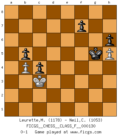 Last move : 0-1 2013 September 14 19:13:16 [Event "FICGS__CHESS__CLASS_F__000130"] [Site "FICGS"] [Date "2013.06.13"] [Round "1"] [White "Leurette,Marc-Antoine"] [Black "Neil,Charlie"] [Result "0-1"] [WhiteElo "1178"] [BlackElo "1053"] 1.e4 e6 2.d4 d5 3.exd5 exd5 4.Bd3 Bd6 5.Nc3 Ne7 6.Nf3 c6 7.O-O O-O 8.a3 Nd7 9.Ng5 h6 10.Nf3 Re8 11.Bd2 Nf8 12.b4 a6 13.Ne2 Bf5 14.Bxf5 Nxf5 15.c3 Qf6 16.Re1 Ne6 17.Qc1 Ne7 18.c4 Nf5 19.cxd5 cxd5 20.Bf4 Bxf4 21.Nxf4 Nexd4 22.Nxd4 Nxd4 23.Rxe8+ Rxe8 24.Ra2 Qf5 25.g3 g5 26.Rd2 Re1+ 27.Qxe1 Nf3+ 28.Kf1 Nxe1 29.Kxe1 gxf4 30.Kd1 fxg3 31.fxg3 Qb1+ 32.Ke2 Qe4+ 33.Kd1 Kg7 34.Kc1 Qc4+ 35.Rc2 Qf1+ 36.Kb2 Qf6+ 37.Kc1 Qa1+ 38.Kd2 Qd4+ 39.Kc1 Qg1+ 40.Kb2 Qd4+ 41.Kc1 Qc4 42.Kb2 b5 43.Rxc4 dxc4 44.Kc3 Kf6 45.h4 Ke5 46.g4 Kf6 47.a4 Ke5 48.axb5 axb5 49.h5 Kf4 50.g5 Kxg5 0-1 French : Exchange variation Kingside Castling by player White (move 7) Kingside Castling by player Black (move 7) 10 pieces endgame at move 48 : White KPPPP , Black KPPPP WHITE : King + 4 Pawns BLACK : King + 4 Pawns 9 pieces endgame at move 48 : White KPPP , Black KPPPP WHITE : King + 3 Pawns BLACK : King + 4 Pawns 8 pieces endgame at move 50 : White KPP , Black KPPPP WHITE : King + 2 Pawns BLACK : King + 4 Pawns Player Black won this chess game. Follow this game move after move (download)White lost because he failed to remember the right continuation and had to think up the moves himself. (Siegbert Tarrasch) Jeder leidlich begabte Spieler, er braucht keineswegs hervorragend veranlagt zu sein, kann es zum Meister bringen. Aber das ist ja auch gar nicht nötig! Der richtige Standpunkt ist es, zu seinem Vergnügen zu spielen, und man glaube ja nicht, dass der Genuss proportional dem Können sei. (Siegbert Tarrasch) Una mala movida nulifica cuarenta buenas. (Horowitz) Vous m'avez demandé de vous exposer quel est le fondement de la prière. Je ne fais que préparer les pièces du jeu sur la table... Nous sera-t-il permis d'en adopter les règles et si nous les appliquons scrupuleusement nous ne tarderons pas à faire mat le Roi divin ! Il ne pourra échapper à nos mains. (Sainte Thérèse d'Avila, Chemin de perfection) Children in the dark cause accidents, accidents in the dark cause children. (Unknown)