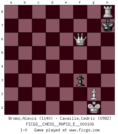 Last move : 1-0 2013 June 19 20:50:57 [Event "FICGS__CHESS__RAPID_E__000106"] [Site "FICGS"] [Date "2013.06.13"] [Round "1"] [White "Bromo,Alexis"] [Black "Cavaille,Cedric"] [Result "1-0"] [WhiteElo "1140"] [BlackElo "0982"] 1.d4 d5 2.c4 dxc4 3.Nc3 c6 4.e4 b5 5.Nf3 Bg4 6.Be2 Nd7 7.h3 Bxf3 8.Bxf3 Qc7 9.O-O e5 10.dxe5 Nxe5 11.Re1 Be7 12.Bg4 Nf6 13.b3 cxb3 14.axb3 Qd6 15.Qxd6 Bxd6 16.Bg5 Nexg4 17.hxg4 Nxg4 18.Red1 Be5 19.Rxa7 f6 20.Rxa8+ Kf7 21.Rxh8 fxg5 22.Rxh7 Bxc3 23.Rh3 c5 24.Rxc3 Kf6 25.Rxc5 b4 26.Rd4 Ne5 27.Rxb4 Nd7 28.Rf5+ Kg6 29.R4b5 Nf6 30.Rxg5+ Kh6 31.Rbe5 Nxe4 32.Rxe4 Kxg5 33.b4 Kf5 34.f3 g5 35.b5 Kf6 36.b6 Kf5 37.b7 g4 38.b8Q gxf3 39.Qf4+ Kg6 40.Re6+ Kg7 41.Qf6+ Kg8 42.Re8+ Kh7 43.Rh8+ 1-0 Queen's gambit accepted Kingside Castling by player White (move 9) 10 pieces endgame at move 30 : White KRRPPPP , Black KNP WHITE : King + 2 Rooks 4 Pawns BLACK : King + 1 Knight 1 Pawn 9 pieces endgame at move 31 : White KRRPPP , Black KNP WHITE : King + 2 Rooks 3 Pawns BLACK : King + 1 Knight 1 Pawn 8 pieces endgame at move 32 : White KRRPPP , Black KP WHITE : King + 2 Rooks 3 Pawns BLACK : King + 1 Pawn 7 pieces endgame at move 32 : White KRPPP , Black KP WHITE : King + 1 Rook 3 Pawns BLACK : King + 1 Pawn Promotion Queen by player White (move 38) 6 pieces endgame at move 38 : White KQRP , Black KP WHITE : King + 1 Queen 1 Rook 1 Pawn BLACK : King + 1 Pawn Player White won this chess game. Follow this game move after move (download)In complicated positions, Bobby Fischer hardly had to be afraid of anybody. (Paul Keres) Fischer ist das größte Genie, das je vom Schachhimmel heruntergestiegen ist. (Mikhail Nekhemyevich Tal) De eso se trata el Ajedrez. Un día le das una lección a tu oponente y al día siguiente el te da una a tí. (Bobby Fischer) Les écrivains ont utilisé les échecs pour analyser les côtés extrêmes de la nature humaine. Dans ce cadre, les échecs offrent un champ d'expérimentation idéal. Mais on pourrait faire la même chose avec la peinture. Et là, en vous référant à Van Gogh, vous ne tirerez pas de conclusion définitive sur les peintres. (Gary Kasparov) As the days dwindle down... to a precious few. (Maxwell Anderson)