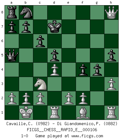 Last move : 1-0 2013 June 25 16:51:59 [Event "FICGS__CHESS__RAPID_E__000106"] [Site "FICGS"] [Date "2013.06.13"] [Round "1"] [White "Cavaille,Cedric"] [Black "Di Giandomenico,Pierino"] [Result "1-0"] [WhiteElo "0982"] [BlackElo "0882"] 1.d4 d5 2.Nc3 c6 3.Nf3 Nf6 4.Bg5 Nh5 5.Qd2 Be6 6.O-O-O Qa5 7.Kb1 Bf5 8.h3 e6 9.g4 Be7 10.gxf5 exf5 11.Bxe7 Kxe7 12.Qg5+ f6 13.Qxh5 g6 14.Qh4 g5 15.Qg3 f4 16.Qg4 h5 17.Qf5 g4 18.Ne5 fxe5 19.Qxe5+ Kd7 20.Qxh8 1-0 Queen's pawn : Chigorin variation Queenside Castling by player White (move 6) Player White won this chess game. Follow this game move after move (download)The game of Chess is not merely an idle amusement; several very valuable qualities of the mind are to be acquired and strengthened by it, so as to become habits ready on all occasions; for life is a kind of Chess. (Benjamin Franklin) Herr Iljumschinow ist ein etwas merkwürdiger Geschäftsmann: Er arbeitet zusammen mit Leuten wie Muammar al-Gaddafi; früher ist das Saddam Hussein gewesen. (Joel Lautier) Todos los Maestros de Ajedrez fueron un día unos principiantes. (Chernev) Un footballeur joue avec ses pieds, parfois avec sa tête. Un joueur d'échecs ne joue qu'avec sa tête. Et quand il ne joue plus, il meurt. (Jacob Murray) Perhaps the current trend of many chess professionals taking up the more lucrative pastime of poker is not a wholly negative one. It may not be too late for humans to relearn how to take risks in order to innovate and thereby maintain the advanced lifestyles we enjoy. And if it takes a poker-playing supercomputer to remind us that we can't enjoy the rewards without taking the risks, so be it. (The Chess Master and the Computer, by Garry Kasparov - 2010)