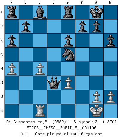 Last move : 0-1 2013 June 30 13:8:26 [Event "FICGS__CHESS__RAPID_E__000106"] [Site "FICGS"] [Date "2013.06.13"] [Round "1"] [White "Di Giandomenico,Pierino"] [Black "Stoyanov,Zdravko"] [Result "0-1"] [WhiteElo "0882"] [BlackElo "1270"] 1.e4 c5 2.Bd3 a6 3.Nf3 Nc6 4.O-O e6 5.Qe2 Be7 6.b3 Nf6 7.Nc3 O-O 8.a4 d6 9.Ba3 h6 10.Rab1 Re8 11.b4 cxb4 12.Bxb4 Nxb4 13.Rxb4 d5 14.exd5 Bxb4 15.Ne4 Nxd5 16.Rb1 Ba5 17.c4 Nf4 18.Qe3 Nxd3 19.Rb3 Nc1 20.Rb1 Nd3 21.Ne1 Ne5 22.Nd6 Qxd6 23.Rc1 Bxd2 24.Nd3 Bxe3 25.fxe3 Qxd3 0-1 Sicilian defense Kingside Castling by player White (move 4) Kingside Castling by player Black (move 7) Player Black won this chess game. Follow this game move after move (download)The only thing Chess players have in common is Chess. (Lodewijk Prins) Ich bin Weltmeister und muß mit niemandem irgend etwas diskutieren. (Viswanathan Anand) Las ideas audaces son como las piezas del Ajedrez que avanzan hacia adelante. Ellas pueden ser vencidas, pero también pueden iniciar una partida victoriosa. (Goethe) Les Echecs ne sont pas pour les âmes timides. Ils requièrent un homme entier, qui ne s'arrête pas aveuglément à ce qui a été déjà établi, mais qui tente individuellement de sonder les profondeurs du jeu. (W. Steinitz) I believe in luck. How else can you explain the success of those you dislike ? (Jean Cocteau)