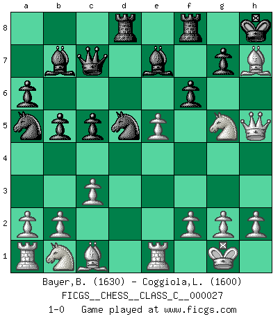Last move : 1-0 2007 March 6 16:42:49 [Event "FICGS__CHESS__CLASS_C__000027"] [Site "FICGS"] [Date "2007.02.01"] [Round "1"] [White "Bayer,Bernhard"] [Black "Coggiola,Leandro Damian"] [Result "1-0"] [WhiteElo "1630"] [BlackElo "1600"] 1.e4 e5 2.Nf3 Nc6 3.Bb5 a6 4.Ba4 Nf6 5.O-O b5 6.Bb3 Be7 7.Re1 O-O 8.c3 Na5 9.Bc2 c5 10.Nxe5 d5 11.d3 dxe4 12.dxe4 Qc7 13.Nf3 Bb7 14.e5 Rad8 15.Qe2 Nd5 16.Ng5 f6 17.Bxh7+ Kh8 18.Qh5 1-0 Ruy Lopez : 5.O-O Kingside Castling by player White (move 5) Kingside Castling by player Black (move 7) Player White won this chess game. Follow this game move after move (download)The battle for the ultimate truth will never be won. And that's why Chess is so fascinating. (Hans Kmoch) Die starken Figuren des Gegners muss man abtauschen. (José Raúl Capablanca) El Ajedrez demanda una total concentración. (Bobby Fischer) Botvinnik disait en comparant les échecs à la musique: Il existe une science dont le but est l'étude de l'acoustique et des sons. Mais il y a aussi un art qui se sert de l'océan des sons : c'est la musique. De toute évidence, il en est de même pour la pensée. La logique est l'étude des lois de la réflexion et les échecs reflètent, en tant qu'art, le côté logique de la réflexion, sous la forme d'images artistiques... Extrait de Fischer - Spassky, Reykjavik 1972 par Alexander & F. Wyndham (Ed. Solar), p 37. Quotation,n.: The act of repeating erroneously the words of another. The words erroneously repeated. (Ambrose Bierce, The Devil's Dictionary)