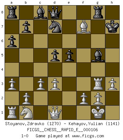 Last move : 1-0 2013 June 30 20:58:43 [Event "FICGS__CHESS__RAPID_E__000106"] [Site "FICGS"] [Date "2013.06.13"] [Round "1"] [White "Stoyanov,Zdravko"] [Black "Kehayov,Yulian"] [Result "1-0"] [WhiteElo "1270"] [BlackElo "1141"] 1.e4 e5 2.Nf3 d6 3.h3 Nf6 4.c3 Be7 5.a3 O-O 6.d3 a6 7.Be2 c6 8.O-O Nbd7 9.Bg5 h6 10.Bh4 d5 11.exd5 cxd5 12.Re1 g5 13.Bxg5 hxg5 14.Nxg5 Nh7 15.Nxh7 Kxh7 16.Bh5 Bf6 17.Re3 Bg5 18.Rg3 Rg8 19.Bxf7 1-0 Philidor's defense Kingside Castling by player Black (move 5) Kingside Castling by player White (move 8) Player White won this chess game. Follow this game move after move (download)Chess is a part of culture and if a culture is declining then Chess too will decline. (Mikhail Botvinnik) Wenn Du nicht kämpfst, um anderen etwas zu beweisen, sondern nur für Dich selbst, dann bist du fast unbesiegbar. (Garry Kasparov) El pensamiento metódico es mas útil en el Ajedrez que la inspiración. (C. J. S. Purdy) Avec des compensations pour le matériel en plus... (Anonyme) He who is a good ruler must first have been ruled. (Aristotle)