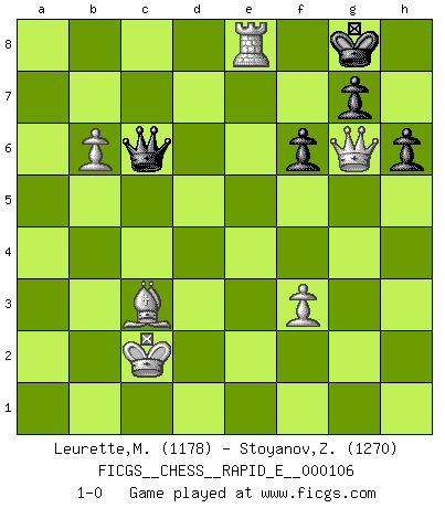 Last move : 1-0 2013 July 4 14:13:43 [Event "FICGS__CHESS__RAPID_E__000106"] [Site "FICGS"] [Date "2013.06.13"] [Round "1"] [White "Leurette,Marc-Antoine"] [Black "Stoyanov,Zdravko"] [Result "1-0"] [WhiteElo "1178"] [BlackElo "1270"] 1.e4 c5 2.Nf3 a6 3.d4 cxd4 4.Nxd4 e5 5.Nf3 Nc6 6.Bc4 h6 7.Nc3 Bb4 8.Bd2 Nf6 9.a3 Bxc3 10.Bxc3 d6 11.h3 O-O 12.O-O b5 13.Bd5 Bb7 14.b4 Nxd5 15.exd5 Ne7 16.a4 Bxd5 17.axb5 axb5 18.Rxa8 Qxa8 19.Qd3 e4 20.Qxb5 exf3 21.gxf3 Bxf3 22.Qd3 Nf5 23.Qxf5 Be4 24.Qg4 f6 25.f3 Bxc2 26.Qe6+ Kh8 27.Rf2 Re8 28.Qxd6 Rd8 29.Qf4 Qc8 30.Rxc2 Qxh3 31.Kf2 Rd1 32.Rd2 Rf1+ 33.Ke3 Qe6+ 34.Qe4 Re1+ 35.Re2 Qb6+ 36.Kd2 Rh1 37.Qd3 Qc6 38.b5 Qc8 39.b6 Rb1 40.Qxb1 Kg8 41.Qg6 Qd7+ 42.Kc2 Qc6 43.Re8+ 1-0 Sicilian : O'Kelly variation Kingside Castling by player Black (move 11) Kingside Castling by player White (move 12) Player White won this chess game. Follow this game move after move (download)Chess teaches you to control the initial excitement you feel when you see something that looks good and it trains you to think objectively when you're in trouble. (Stanley Kubrick) Man wirke der falschen Auffassung entgegen, als ob jeder Zug Unmittelbares zu leisten habe; auch Werte- und Ruhezüge haben ihre Existenzberechtigung. (Aaron Nimzowitsch) En el Ajedrez, cuando menos, el valiente hereda la tierra. (Edmar Mednis) Aidez vos pièces, elles vous aideront. (Paul Morphy) However beautiful the strategy, you should occasionally look at the results. (Winston Churchill)