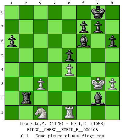 Last move : 0-1 2013 August 30 0:58:50 [Event "FICGS__CHESS__RAPID_E__000106"] [Site "FICGS"] [Date "2013.06.13"] [Round "1"] [White "Leurette,Marc-Antoine"] [Black "Neil,Charlie"] [Result "0-1"] [WhiteElo "1178"] [BlackElo "1053"] 1.e4 c5 2.Nf3 d6 3.h3 Nc6 4.d4 cxd4 5.Nxd4 Nf6 6.Nc3 Bd7 7.Bb5 a6 8.Bc4 e6 9.O-O Ne5 10.b3 Nxc4 11.bxc4 Be7 12.a4 O-O 13.Bg5 h6 14.Bxf6 Bxf6 15.Nce2 Rc8 16.Qd3 Re8 17.Ra2 Qc7 18.f3 Qc5 19.c3 e5 20.Kh2 Qxc4 21.Qxc4 Rxc4 22.Nf5 Rxa4 23.Rxa4 Bxa4 24.Nxd6 Rd8 25.Nxb7 Rd2 26.Nc5 Bb5 27.Re1 Bxe2 28.Nb3 Rb2 29.Nc1 Bxf3 30.Kg3 Bxg2 0-1 This chess game has been lost on time (started : 2013.06.13 0:47:15) Sicilian Kingside Castling by player White (move 9) Kingside Castling by player Black (move 12) Player Black won this chess game. Follow this game move after move (download)Avoid the crowd. Do your own thinking independently. Be the Chess player, not the Chess piece. (Ralph Charell) Ein guter Spieler hat immer Glück. (José Raúl Capablanca) El Ajedrez es la vida. (Bobby Fischer) Des points faibles ou des trous dans la position de l'adversaire doivent être occupés par des pièces et non pas par des pions. (Siegbert Tarrasch) Every man's memory is his private literature. (Aldous Huxley)