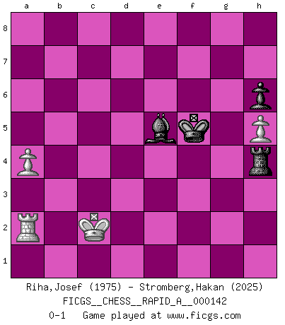 Last move : 0-1 2013 July 18 16:49:37 [Event "FICGS__CHESS__RAPID_A__000142"] [Site "FICGS"] [Date "2013.06.13"] [Round "1"] [White "Riha,Josef"] [Black "Stromberg,Hakan"] [Result "0-1"] [WhiteElo "1975"] [BlackElo "2025"] 1.e4 c5 2.Nf3 d6 3.d4 cxd4 4.Nxd4 Nf6 5.Nc3 a6 6.Be3 e5 7.Nb3 Be6 8.f3 Be7 9.Qd2 O-O 10.O-O-O Nbd7 11.g4 b5 12.g5 b4 13.Ne2 Ne8 14.f4 a5 15.f5 a4 16.Nbd4 exd4 17.Nxd4 b3 18.Kb1 bxc2+ 19.Nxc2 Nc7 20.fxe6 Nxe6 21.h4 Rb8 22.Nd4 Ne5 23.Nxe6 fxe6 24.Bh3 Qc8 25.Rc1 Qd7 26.Rc2 Kh8 27.Rhc1 d5 28.exd5 Nf3 29.Qd1 Qxd5 30.Qxd5 exd5 31.Ba7 Rb4 32.Rf2 h5 33.gxh6 gxh6 34.h5 a3 35.Rc7 Bg5 36.b3 Re4 37.Kc2 Re1 38.Kc3 Rf4 39.b4 d4+ 40.Kc2 Ne5 41.Rxf4 d3+ 42.Kb3 Bxf4 43.Bd4 d2 44.Bg4 d1Q+ 45.Bxd1 Rxd1 46.Bc3 Kg8 47.Kxa3 Kf8 48.Kb3 Nf7 49.Rc4 Rb1+ 50.Kc2 Rf1 51.b5 Nd6 52.Rd4 Nxb5 53.Bb4+ Kf7 54.Re4 Kf6 55.a4 Nc7 56.Kd3 Nd5 57.Be1 Kf5 58.Re2 Be5 59.Bd2 Nf4+ 60.Bxf4 Rxf4 61.Ra2 Rd4+ 62.Kc2 Rh4 0-1 Sicilian : Najdorf, Byrne (English) attack Kingside Castling by player Black (move 9) Queenside Castling by player White (move 10) Promotion Queen by player Black (move 44) 10 pieces endgame at move 52 : White KRBPP , Black KRBNP WHITE : King + 1 Rook 1 Bishop 2 Pawns BLACK : King + 1 Rook 1 Bishop 1 Knight 1 Pawn 9 pieces endgame at move 60 : White KRBPP , Black KRBP WHITE : King + 1 Rook 1 Bishop 2 Pawns BLACK : King + 1 Rook 1 Bishop 1 Pawn 8 pieces endgame at move 60 : White KRPP , Black KRBP WHITE : King + 1 Rook 2 Pawns BLACK : King + 1 Rook 1 Bishop 1 Pawn Player Black won this chess game. Follow this game move after move (download)Best by test: 1. e4 (Bobby Fischer) Oft bringt ein stiller Zug das Erdbeben. (Richard Reti) Entre mas años cumplo, mas valoro los Peones. (Keres) RxDa4 pat (...) If we don't succeed, we run the risk of failure. (George W. Bush)