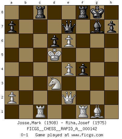 Last move : 0-1 2013 July 12 20:28:1 [Event "FICGS__CHESS__RAPID_A__000142"] [Site "FICGS"] [Date "2013.06.13"] [Round "1"] [White "Josse,Mark"] [Black "Riha,Josef"] [Result "0-1"] [WhiteElo "1908"] [BlackElo "1975"] 1.d4 Nf6 2.c4 g6 3.Nc3 Bg7 4.e4 d6 5.Nf3 O-O 6.Be2 e5 7.O-O Nc6 8.d5 Ne7 9.Ne1 Nd7 10.Be3 f5 11.f3 f4 12.Bf2 g5 13.Rc1 Ng6 14.Nb5 b6 15.b4 Nf6 16.c5 bxc5 17.bxc5 g4 18.cxd6 cxd6 19.Nd3 g3 20.hxg3 Nh5 21.gxf4 Ngxf4 22.Nc7 Nxg2 23.Kxg2 Qg5+ 24.Kh1 Qh6 25.Bg1 Ng3+ 26.Kg2 Nxe2 27.Qxe2 Bh3+ 28.Kf2 Qh4+ 29.Ke3 Bh6+ 30.f4 exf4+ 31.Kd4 Rac8 32.Ne6 Bxe6 33.dxe6 Bg7+ 34.Kd5 Qe7 0-1 King's Indian : Orthodox, Aronin-Taimanov variation (Yugoslav attack / Mar del Plata variation) Kingside Castling by player Black (move 5) Kingside Castling by player White (move 7) Player Black won this chess game. Follow this game move after move (download)Chess is the art of analysis. (Mikhail Botvinnik) Kein Schachspieler kann gut schlafen. (H. G. Wells) Cuando tengo las piezas blancas, yo gano porque soy blanco; Cuando tengo las piezas negras, yo gano porque soy Bogolyubov. (Bogolyubov) Karpov est une pièce de musée. (Garry Kasparov) Rules and bones are meant to be broken. (Anonymous)