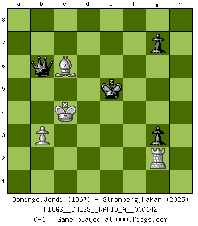 Last move : 0-1 2013 November 7 23:50:59 [Event "FICGS__CHESS__RAPID_A__000142"] [Site "FICGS"] [Date "2013.06.13"] [Round "1"] [White "Domingo,Jordi"] [Black "Stromberg,Hakan"] [Result "0-1"] [WhiteElo "1967"] [BlackElo "2025"] 1.e4 c5 2.Nf3 d6 3.d4 cxd4 4.Nxd4 Nf6 5.Nc3 a6 6.Be3 e5 7.Nb3 Be6 8.f3 Be7 9.Qd2 O-O 10.O-O-O Nbd7 11.g4 b5 12.g5 b4 13.Ne2 Ne8 14.f4 a5 15.f5 a4 16.fxe6 axb3 17.cxb3 fxe6 18.Bh3 Nc7 19.Kb1 Kh8 20.Rhg1 d5 21.exd5 Nxd5 22.Bxe6 Nxe3 23.Qxe3 Bc5 24.Qg3 Bxg1 25.Qxg1 Qa5 26.Rxd7 Qxa2+ 27.Kc2 Rac8+ 28.Kd3 Qxb2 29.Qg4 Qc2+ 30.Ke3 Qc5+ 31.Ke4 Qc6+ 32.Ke3 Qb6+ 33.Kd3 Rf1 34.g6 e4+ 35.Kd2 Qa5 36.Ke3 Qe5 37.Rf7 Rc3+ 38.Nxc3 Qxc3+ 39.Kxe4 Qc2+ 40.Ke3 Qc1+ 41.Ke4 Re1+ 42.Kd5 Rd1+ 43.Qd4 Rxd4+ 44.Kxd4 Qc3+ 45.Ke4 hxg6 46.h3 Qc6+ 47.Ke5 Qc5+ 48.Ke4 Qd6 49.Bd5 Kh7 50.Kd4 g5 51.Kc4 Kg6 52.Rb7 Kf6 53.Rxb4 Qf4+ 54.Kb5 Qf1+ 55.Kc5 Qxh3 56.Rb6+ Ke5 57.Re6+ Kf5 58.Re2 Qc3+ 59.Kd6 g4 60.Rf2+ Kg5 61.Re2 g3 62.Re5+ Kf4 63.Re4+ Kf5 64.Re2 Qf6+ 65.Kc5 Qa6 66.Rg2 Ke5 67.Bc6 Qa5+ 68.Kc4 Qb6 0-1 Sicilian : Najdorf, Byrne (English) attack Kingside Castling by player Black (move 9) Queenside Castling by player White (move 10) 10 pieces endgame at move 45 : White KRBPP , Black KQPPP WHITE : King + 1 Rook 1 Bishop 2 Pawns BLACK : King + 1 Queen 3 Pawns 9 pieces endgame at move 53 : White KRBPP , Black KQPP WHITE : King + 1 Rook 1 Bishop 2 Pawns BLACK : King + 1 Queen 2 Pawns 8 pieces endgame at move 55 : White KRBP , Black KQPP WHITE : King + 1 Rook 1 Bishop 1 Pawn BLACK : King + 1 Queen 2 Pawns Player Black won this chess game. Follow this game move after move (download)When your house is on fire, you can't be bothered with the neighbors. Or, as we say in Chess, if your King is under attack you don't worry about losing a Pawn on the Queen's side. (Gary Kasparov) Es ist wirklich schade, dass so viele Schachspieler nicht auf ihr Äußeres achten! (Alexandra Kosteniuk) Cuando tengas duda... ¡juega al Ajedrez!. (Tevis) Je crois qu'il existe des manières très spécifiques de jouer efficacement contre une machine. Evidemment, nous n'avons aucune chance en technique pure, parce que l'ordinateur calcule de manière parfaite. Mais lorsque nous faisons appel à notre cerveau, en utilisant l'intuition et la compréhension, alors nous restons beaucoup plus forts. (Anatoli Karpov) A good teacher is like a candle - it consumes itself to light the way for others. (Author unknown)