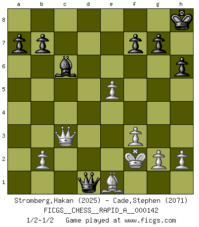 Last move : 1/2-1/2 2013 July 4 11:10:25 [Event "FICGS__CHESS__RAPID_A__000142"] [Site "FICGS"] [Date "2013.06.13"] [Round "1"] [White "Stromberg,Hakan"] [Black "Cade,Stephen"] [Result "1/2-1/2"] [WhiteElo "2025"] [BlackElo "2071"] 1.e4 c6 2.c4 d5 3.exd5 cxd5 4.cxd5 Nf6 5.Nc3 Nxd5 6.Nf3 Nc6 7.Bb5 e6 8.O-O Be7 9.d4 O-O 10.Re1 Bd7 11.Nxd5 exd5 12.Bd2 Bf6 13.Bxc6 Bxc6 14.Ne5 Bxe5 15.dxe5 d4 16.Qg4 Qd5 17.f3 Kh8 18.Rad1 Qxa2 19.Qxd4 Rfd8 20.Qc3 Qe6 21.Bg5 Rxd1 22.Rxd1 Re8 23.Rd8 Rxd8 24.Bxd8 Qd7 25.Bh4 Qd1+ 26.Be1 h6 27.Kf2 1/2-1/2 Caro-Kann : Anti-anti-Caro-Kann defense Kingside Castling by player White (move 8) Kingside Castling by player Black (move 9) This chess game ended in a draw. Follow this game move after move (download)You sit at the board and suddenly your heart leaps. Your hand trembles to pick up the piece and move it. But what Chess teaches you is that you must sit there calmly and think about whether it's really a good idea and whether there are other better ideas. (Stanley Kubrick) Die Auseinandersetzung mit Karpow war politisch geprägt. Er stand für das kommunistische System, wurde von dessen Repräsentanten gehätschelt. Ich war der Oppositionelle. Jeder Schachweltmeister spiegelt auch die gesellschaftlichen Verhältnisse wider. Kramnik steht für die Börsen-Generation des Neuen Markts, ideologiefrei, zahlenfixiert. (Garry Kasparov) Hay dos clases de hombres: aquellos que se conforman en dejarse llevar por las circunstancias y que juegan barajas y aquellos decididos a controlar las circunstancias y que juegan al Ajedrez. (Mortimer Collins) Ce n'est pas pour s'amuser qu'il joue aux échecs : il célèbre un culte. (Vladimir Nabokov) I don't believe in psychology. I believe in good moves. (Bobby Fischer)