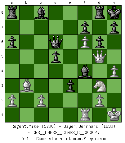 Last move : 0-1 2007 September 6 1:18:35 [Event "FICGS__CHESS__CLASS_C__000027"] [Site "FICGS"] [Date "2007.02.01"] [Round "1"] [White "Regent,Mike"] [Black "Bayer,Bernhard"] [Result "0-1"] [WhiteElo "1700"] [BlackElo "1630"] 1.e4 c5 2.Nf3 d6 3.d4 cxd4 4.Nxd4 Nf6 5.Nc3 a6 6.Bc4 e6 7.O-O b5 8.Bb3 Be7 9.f4 O-O 10.Kh1 b4 11.e5 bxc3 12.exf6 Bxf6 13.f5 e5 14.Ne2 cxb2 15.Bxb2 Bb7 16.Ng3 Qc7 17.Qg4 Nd7 18.Nh5 Kh8 19.h4 Nc5 20.Ba3 d5 21.Rad1 Rfd8 22.Bxc5 Qxc5 23.Rf3 e4 24.Rg3 Be5 25.f6 g6 26.Qg5 Qd6 27.Rg4 e3 28.Rf1 Rg8 29.Ng3 Bc8 30.Rgf4 Bxf4 0-1 Sicilian : Najdorf, Lipnitzky attack Kingside Castling by player White (move 7) Kingside Castling by player Black (move 9) Player Black won this chess game. Follow this game move after move (download)After black's reply to 1.e4 with 1..e5, leaves him always trying to get into the game. (Howard Staunton) Gott hat gewollt, dass ich Champion werde. (Surab Azmajparaschvili) Los Peones son nacidos libres, y aún así, se encuentran encadenados por todos lados. (Rick Kennedy) A chaque perte on perd un peu de soi. (Joël Lautier) Political correctness is subjecting us to gross incompetence. (Johann Piek)