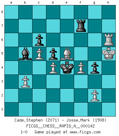 Last move : 1-0 2013 August 10 15:18:18 [Event "FICGS__CHESS__RAPID_A__000142"] [Site "FICGS"] [Date "2013.06.13"] [Round "1"] [White "Cade,Stephen"] [Black "Josse,Mark"] [Result "1-0"] [WhiteElo "2071"] [BlackElo "1908"] 1.d4 Nf6 2.c4 e6 3.Nf3 d5 4.Nc3 Bb4 5.cxd5 exd5 6.Bg5 h6 7.Bh4 c5 8.e3 Nc6 9.Bb5 g5 10.Bg3 Ne4 11.dxc5 Nxc3 12.Bxc6+ bxc6 13.Qd4 Nxa2 14.Nd2 O-O 15.Rxa2 a5 16.O-O Re8 17.Rfa1 Bf5 18.Bd6 f6 19.f3 Bd7 20.Nb3 f5 21.Kh1 Kf7 22.Nc1 Qf6 23.Nd3 Qxd4 24.exd4 Bd2 25.Rd1 Be3 26.Ne5+ Ke6 27.Ra3 Bf4 28.Rda1 Bxe5 29.Bxe5 Bc8 30.Kg1 Bb7 31.f4 g4 32.Kf2 Kf7 33.Rb3 Ba6 34.h3 Kg6 35.hxg4 fxg4 36.Rb6 Bb5 37.Rb7 Rg8 38.Kg3 h5 39.Rd7 Rad8 40.Rxd8 Rxd8 41.Rxa5 Rf8 42.Ra7 Rf7 43.Ra8 Rf5 44.Kh4 Kh6 45.Ra7 Kg6 46.Rg7+ Kh6 47.Rd7 Kg6 48.b3 Rf7 49.Rd6+ Kf5 50.Rh6 Ke4 51.Kxh5 1-0 Queen's pawn game Kingside Castling by player Black (move 14) Kingside Castling by player White (move 16) Player White won this chess game. Follow this game move after move (download)My opponents make good moves too. Sometimes I don't take these things into consideration. (Bobby Fischer) Es gibt keine einzige Frau, der ich nicht einen Springer vorgeben könnte und trotzdem gewänne. (Robert James Fischer) El Ajedrez es la vida. (Bobby Fischer) Tous ces prétendus hommes politiques sont les pions, les Cavaliers, les Tours ou les Fous d'une partie d'échecs qui se jouera tant qu'un hasard ne renversera pas l'échiquier. (Honoré de Balzac) Man is reluctant to give credit for intelligence to anyone, except his enemies. (Albert Einstein)