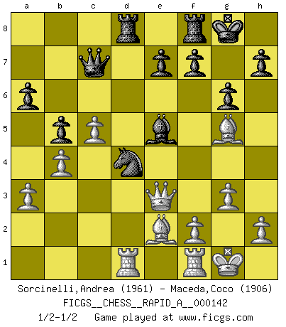Last move : 1/2-1/2 2013 September 18 22:59:6 [Event "FICGS__CHESS__RAPID_A__000142"] [Site "FICGS"] [Date "2013.06.13"] [Round "1"] [White "Sorcinelli,Andrea"] [Black "Maceda,Coco"] [Result "1/2-1/2"] [WhiteElo "1961"] [BlackElo "1906"] 1.d4 Nf6 2.c4 g6 3.Nc3 d5 4.Qb3 dxc4 5.Qxc4 Bg7 6.Nf3 O-O 7.e4 a6 8.Be2 b5 9.Qb3 c5 10.dxc5 Bb7 11.e5 Nfd7 12.Be3 Nxe5 13.Rd1 Nbd7 14.Nxe5 Bxe5 15.Nd5 Qa5+ 16.Bd2 Bxd5 17.Qxd5 Qc7 18.b4 Nf6 19.Qf3 Rad8 20.a3 Nh5 21.g3 Ng7 22.O-O Nf5 23.Bg5 Nd4 24.Qe3 1/2-1/2 King's Indian defense, 3.Nc3 Kingside Castling by player Black (move 6) Kingside Castling by player White (move 22) This chess game ended in a draw. Follow this game move after move (download)It is not a move, even the best move that you must seek, but a realizable plan. (Eugene Znosko-Borovsky) Herr Iljumschinow ist ein etwas merkwürdiger Geschäftsmann: Er arbeitet zusammen mit Leuten wie Muammar al-Gaddafi; früher ist das Saddam Hussein gewesen. (Joel Lautier) Uno no tiene que jugar muy bien, es suficiente jugar mejor que el oponente. (Siegbert Tarrasch) Roi des jeux et jeu des rois, les échecs portent en eux un sentiment d'infini. Ils donnent à celui qui s'est efforcé d'en approfondir les arcanes l'impression de n'être pas à la mesure de l'homme; en fait, ils constituent un résumé de l'univers, un microcosme, et figurent cette grande échelle qui, dans les plans de la lumière descend jusqu'à la matière, qui des abîmes insondables remonte jusqu'en l'infini de Dieu. (Pyrame) There are two kinds of tragedy in this world, one is not getting what you want and the other is getting. (Lord of war)