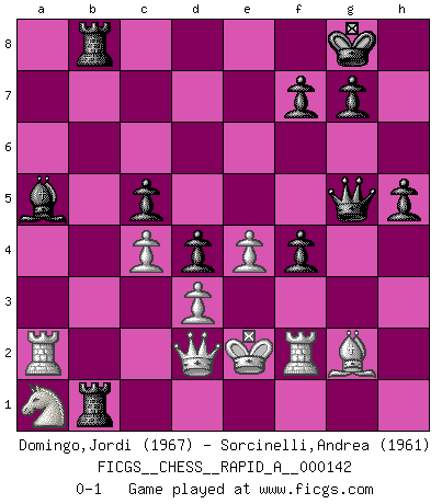 Last move : 0-1 2013 October 7 19:13:34 [Event "FICGS__CHESS__RAPID_A__000142"] [Site "FICGS"] [Date "2013.06.13"] [Round "1"] [White "Domingo,Jordi"] [Black "Sorcinelli,Andrea"] [Result "0-1"] [WhiteElo "1967"] [BlackElo "1961"] 1.g4 d5 2.h3 e5 3.Bg2 Nc6 4.d3 Be6 5.a3 h5 6.g5 Nge7 7.Nf3 Ng6 8.Nc3 Qd7 9.e4 d4 10.Nd5 Nd8 11.c3 c6 12.Nb4 Be7 13.a4 O-O 14.a5 Rc8 15.Nc2 c5 16.c4 Nc6 17.a6 Rb8 18.axb7 Rxb7 19.Ra3 Rfb8 20.Na1 Nf4 21.Bxf4 exf4 22.b3 Bd8 23.Qd2 Bc7 24.h4 a5 25.Kf1 Bg4 26.Ne1 a4 27.Rxa4 Ne5 28.f3 Rxb3 29.Ra2 Rb1 30.Kf2 Bxf3 31.Nxf3 Qg4 32.Rh3 Nxf3 33.Rxf3 Qxh4+ 34.Ke2 Qxg5 35.Rf2 Ba5 0-1 Grob's attack Kingside Castling by player Black (move 13) Player Black won this chess game. Follow this game move after move (download)Adequate compensation for a sacrifice is having a sound combination leading to a winning position; adequate compensation for a blunder is having your opponent snatch defeat from the jaws of victory. (Bruce A. Moon) Irgendwie scheint mir sonntags früh um 9 Uhr der Killerinstinkt verloren gegangen zu sein. (Alexej Shirov) Cuando tengo las piezas blancas, yo gano porque soy blanco; Cuando tengo las piezas negras, yo gano porque soy Bogolyubov. (Bogolyubov) Tout change constamment, y compris dans le monde des Echecs. (Botvinnik) The general who wins the battle makes many calculations in his temple before the battle is fought. The general who loses makes but few calculations beforehand. (Sun Tzu)