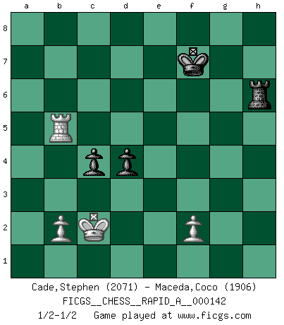 Last move : 1/2-1/2 2013 August 20 11:13:15 [Event "FICGS__CHESS__RAPID_A__000142"] [Site "FICGS"] [Date "2013.06.13"] [Round "1"] [White "Cade,Stephen"] [Black "Maceda,Coco"] [Result "1/2-1/2"] [WhiteElo "2071"] [BlackElo "1906"] 1.d4 d5 2.c4 c6 3.Nf3 Nf6 4.Nc3 e6 5.Bg5 h6 6.Bh4 dxc4 7.e4 g5 8.Bg3 b5 9.Be2 Bb7 10.e5 Nd5 11.Nd2 Qb6 12.h4 Nd7 13.hxg5 c5 14.a4 a6 15.axb5 axb5 16.Rxa8+ Bxa8 17.dxc5 Nxc3 18.cxb6 Nxd1 19.Kxd1 Bxg2 20.Rh5 Bd5 21.Bf3 Nxb6 22.Bf4 Bc5 23.Ne4 Bd4 24.Kc2 Kf8 25.gxh6 Nd7 26.Ng5 Bxe5 27.Bxd5 exd5 28.Nxf7 Kxf7 29.Bxe5 Nxe5 30.Rxe5 d4 31.Rxb5 Rxh6 1/2-1/2 QGD Slav : 4.Nc3 10 pieces endgame at move 30 : White KRPPP , Black KRPPP WHITE : King + 1 Rook 3 Pawns BLACK : King + 1 Rook 3 Pawns 9 pieces endgame at move 31 : White KRPPP , Black KRPP WHITE : King + 1 Rook 3 Pawns BLACK : King + 1 Rook 2 Pawns 8 pieces endgame at move 31 : White KRPP , Black KRPP WHITE : King + 1 Rook 2 Pawns BLACK : King + 1 Rook 2 Pawns This chess game ended in a draw. Follow this game move after move (download)The most important feature of the Chess position is the activity of the pieces. This is absolutely fundamental in all phases of the game: Opening, Middlegame and especially Endgame. The primary constraint on a piece's activity is the Pawn structure. (Michael Stean) Pläne sind die Träume des Verständigen. (Ernst Freiherr von Feuchtersleben) Nunca antes ha habido un jugador de Ajedrez con tal conocimiento a fondo de las complejidades del juego y una inmensa voluntad absolutamente indomable de ganar. Yo pienso que Fischer es el jugador mas grande que jamás haya existido. (Lisa Lane) Des points faibles ou des trous dans la position de l'adversaire doivent être occupés par des pièces et non pas par des pions. (Siegbert Tarrasch) All politicians must be presumed guilty until they are proven innocent. (Dinesh De Silva)