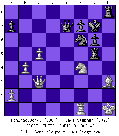 Last move : 0-1 2013 September 18 19:43:47 [Event "FICGS__CHESS__RAPID_A__000142"] [Site "FICGS"] [Date "2013.06.13"] [Round "1"] [White "Domingo,Jordi"] [Black "Cade,Stephen"] [Result "0-1"] [WhiteElo "1967"] [BlackElo "2071"] 1.e4 c6 2.d4 d5 3.e5 Bf5 4.Nc3 e6 5.g4 Bg6 6.Nge2 c5 7.h4 h5 8.Nf4 Bh7 9.Nxh5 Nc6 10.dxc5 Bxc5 11.Bg2 Kf8 12.Bg5 Qa5 13.O-O Bd4 14.Rb1 Bxe5 15.f4 Qc5+ 16.Kh1 Bf6 17.f5 Bxg5 18.hxg5 exf5 19.gxf5 Nce7 20.Nxd5 Bxf5 21.Ndf4 g6 22.Bxb7 Rb8 23.b4 Qb6 24.Bg2 Rh7 25.c4 Bxb1 26.Qxb1 Nf5 27.Bh3 Qb7+ 28.Kh2 Qc7 29.Bxf5 Rxh5+ 30.Bh3 Rxg5 31.c5 Nf6 32.Qb2 Kg7 33.Kh1 Qe7 34.Qc3 Rh8 0-1 Caro-Kann : Advance variation Kingside Castling by player White (move 13) Player Black won this chess game. Follow this game move after move (download)Castle early and often. (Rob Sillars) Ivan Sokolov treibt mich als Beifahrer an mit go Loeky go - . (Loek van Wely) Ciertamente, de todas la drogas del mundo, el Ajedrez debe ser el mas placentero permamentemente. (Assiac) Les Echecs sont affaire de jugement sensible. Savoir quand frapper et quand esquiver. (Fischer) Warrior pose battles inner weakness and wins focus. You see that there is no war within you. You're on your own side, and you are your own strength. (Terri Guillemets)