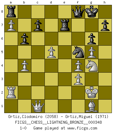 Last move : 1-0 2013 June 13 16:19:43 [Event "FICGS__CHESS__LIGHTNING_BRONZE__000348"] [Site "FICGS"] [Date "2013.06.13"] [Round "1"] [White "Ortiz,Clodomiro"] [Black "Ortiz,Miguel"] [Result "1-0"] [WhiteElo "2058"] [BlackElo "1971"] 1.d4 f5 2.g3 e6 3.Nf3 Nf6 4.Bg2 d5 5.O-O Bd6 6.c4 O-O 7.a3 Nc6 8.Qc2 a6 9.Rd1 Qe8 10.b3 b6 11.Nc3 Rb8 12.cxd5 exd5 13.Bb2 Ne7 14.e3 a5 15.Ne5 Ba6 16.Ne2 Ng6 17.Rac1 Qe6 18.Re1 Rbe8 19.Nf4 Nxf4 20.exf4 Qc8 21.Bf1 g6 22.Bd3 Qb7 23.Qe2 Bxd3 24.Qxd3 Re6 25.Re2 Rfe8 26.Rec2 Ra8 27.Rc6 Qa6 28.Qc2 Rae8 29.Kg2 Ng4 30.a4 Nf6 31.Qc3 Bb4 32.Qf3 Bd6 33.R1c2 Ne4 34.Qd1 Qa8 35.Qd3 Nf6 36.h3 Qd8 37.Qb5 R8e7 38.Bc1 Qf8 39.g4 Qd8 40.f3 Qe8 41.Bd2 fxg4 42.hxg4 Qf8 43.Be1 Re8 44.Bg3 Qg7 45.Rc1 Kh8 46.Re1 Kg8 47.g5 Nh5 48.Qxd5 Qe7 49.Re4 Kg7 50.Qc4 Qd8 51.Bh2 R6e7 52.d5 Qc8 53.Qd4 Kg8 54.Qc3 Kf8 55.R6c4 Qf5 56.Qd4 Rg7 57.Qe3 Rge7 58.Qc3 Ng7 59.Qd4 Rd8 60.Qe3 Rde8 61.Qd3 Nh5 62.Rcd4 Ng7 63.Qc3 Nh5 64.Re2 Bb4 65.Rxb4 axb4 66.Qxb4 Kg7 67.Qd4 Kf8 68.Qe4 Ng7 69.Qb4 Kg8 70.Qc4 Kh8 71.b4 Qf8 72.a5 Nf5 73.a6 Nh4+ 74.Kf2 Nf5 75.Ra2 Ra8 76.a7 Kg7 77.Bg1 Nd6 78.Qc1 Kg8 79.Ng4 Nf5 80.Kg2 1-0 Dutch defense Kingside Castling by player White (move 5) Kingside Castling by player Black (move 6) Player White won this chess game. Follow this game move after move (download)Chess demands total concentration. (Bobby Fischer) Als ich elf wurde, wurde ich einfach gut. (Robert James Fischer) Robert Fischer es la ley hacia si mismo. (Larry Evans) La tactique, c'est ce que vous faites quand il y a quelque chose à faire; la stratégie, c'est ce que vous faites quand il n'y a rien à faire. (Savielli Tartacower) Games, world of games... There's always an opponent, and there's always a victim. (Revolver, movie)