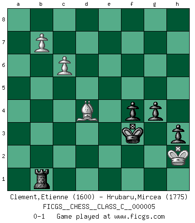 Last move : 0-1 2006 September 1 2:27:55 [Event "FICGS__CHESS__CLASS_C__000005"] [Site "FICGS"] [Date "2006.05.20"] [Round "1"] [White "Clement,Etienne"] [Black "Hrubaru,Mircea"] [Result "0-1"] [WhiteElo "1600"] [BlackElo "1775"] 1.e4 c6 2.d4 d5 3.Nc3 g6 4.Nf3 Bg7 5.h3 a6 6.Bd3 dxe4 7.Nxe4 Nf6 8.Nxf6 Bxf6 9.O-O Bxd4 10.Nxd4 Qxd4 11.Re1 Nd7 12.Qe2 e6 13.c3 Qh4 14.Be3 O-O 15.Rad1 Re8 16.Qd2 Qe7 17.Bc4 e5 18.b4 a5 19.a3 axb4 20.axb4 Nf6 21.Bc5 Qd7 22.Qh6 Qf5 23.f4 Be6 24.fxe5 Nd5 25.Rd4 Qh5 26.Qd2 h6 27.h4 b5 28.Bd3 Bg4 29.Bxb5 cxb5 30.Rxd5 Be6 31.Rd4 g5 32.Qd3 gxh4 33.Qxb5 h3 34.Qe2 Qg5 35.Qd2 Qg6 36.c4 Kh7 37.g4 Bxg4 38.Kh2 Rg8 39.Rg1 Qh5 40.Rf4 Bf5 41.Qf2 Rxg1 42.Rxf5 Rg5 43.Rxg5 hxg5 44.Bd6 g4 45.e6 fxe6 46.b5 Qf5 47.Qxf5+ exf5 48.b6 Ra2+ 49.Kh1 Rb2 50.c5 Kg6 51.Bc7 Kg5 52.Be5 Rb1+ 53.Kh2 f4 54.Bd4 Kf5 55.c6 Ke4 56.b7 Kf3 0-1 Caro-Kann : Gurgenidze system Kingside Castling by player White (move 9) Kingside Castling by player Black (move 14) 10 pieces endgame at move 47 : White KQBPP , Black KRPPP WHITE : King + 1 Queen 1 Bishop 2 Pawns BLACK : King + 1 Rook 3 Pawns 9 pieces endgame at move 47 : White KBPP , Black KRPPP WHITE : King + 1 Bishop 2 Pawns BLACK : King + 1 Rook 3 Pawns Player Black won this chess game. Follow this game move after move (download)Chess is mental torture. (Garry Kasparov) Stelle das Brett so, daß die Sonne in die Augen deines Gegners scheint. (Ruy López) Todavía soy una víctima del Ajedrez. Tiene toda la belleza del arte y mucho mas. No puede ser comercializado. El Ajedrez es mas puro que el arte en su posición social. (Marcel Duchamp) D'abord les bases : Jouez et étudiez, puis étudiez et jouez, ensuite jouez et étudiez, puis étudiez et jouez. Deuxièmement : Donnez toujours le meilleur de vous-même ! (Ken Smith) Memory is a complicated thing, a relative to truth, but not its twin. (Barbara Kingsolver, Animal Dreams)