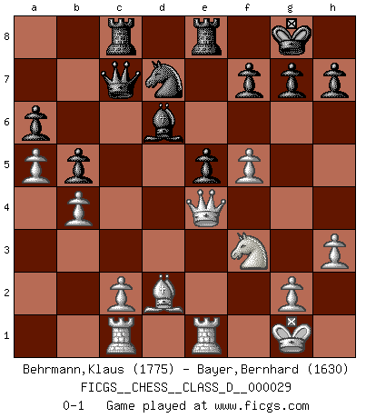 Last move : 0-1 2007 April 7 9:53:44 [Event "FICGS__CHESS__CLASS_D__000029"] [Site "FICGS"] [Date "2007.02.01"] [Round "1"] [White "Behrmann,Klaus"] [Black "Bayer,Bernhard"] [Result "0-1"] [WhiteElo "1775"] [BlackElo "1630"] 1.e4 c5 2.Nf3 d6 3.d4 cxd4 4.Nxd4 Nf6 5.Nc3 a6 6.f4 e5 7.Nf3 Nbd7 8.Bd3 Be7 9.O-O O-O 10.a4 Nc5 11.Qe2 Bg4 12.h3 Be6 13.f5 Bd7 14.Rd1 Bc6 15.a5 Qc7 16.Bg5 b5 17.b4 Ncd7 18.Re1 Rfe8 19.Bd2 d5 20.exd5 Nxd5 21.Nxd5 Bxd5 22.Be4 Bxe4 23.Qxe4 Rac8 24.Rac1 Bd6 0-1 Sicilian : Najdorf, 6.f4 Kingside Castling by player White (move 9) Kingside Castling by player Black (move 9) Player Black won this chess game. Follow this game move after move (download)A Chess game is a dialogue, a conversation between a player and his opponent. Each move by the opponent may contain threats or be a blunder, but a player cannot defend against threats or take advantage of blunders if he does not first ask himself: What is my opponent planning after each move ? (Bruce A. Moon) Ich moechte nie einem Club beitreten, der Leute wie mich als Mitglieder aufnimmt. (Woody Allen) Una clavada es mas poderosa que una espada. (Fred Reinfeld) Les échecs sont un jeu terrible. Si vous n'avez pas le centre, votre adversaire a une position plus libre. Par contre, si vous avez le centre, alors vous avez vraiment quelque chose pour laquelle vous inquiéter ! (Siegbert Tarrasch) Good decisions come from experience, and experience comes from bad decisions. (Anonymous)