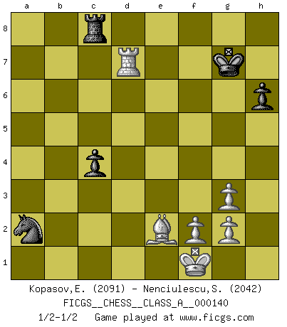 Last move : 1/2-1/2 2014 February 2 10:59:28 [Event "FICGS__CHESS__CLASS_A__000140"] [Site "FICGS"] [Date "2013.06.16"] [Round "1"] [White "Kopasov,Evgeny"] [Black "Nenciulescu,Silviu"] [Result "1/2-1/2"] [WhiteElo "2091"] [BlackElo "2042"] 1.d4 d5 2.c4 c6 3.Nf3 Nf6 4.Nc3 e6 5.Bg5 h6 6.Bh4 dxc4 7.e4 g5 8.Bg3 b5 9.Be2 Bb7 10.Qc2 Nbd7 11.Rd1 Nh5 12.d5 cxd5 13.exd5 exd5 14.Nxd5 Nxg3 15.hxg3 Bg7 16.Ne3 Qa5+ 17.Kf1 Rd8 18.Nf5 Kf8 19.Rd6 Qxa2 20.Nxg7 Kxg7 21.Qd2 Qb1+ 22.Bd1 Bc8 23.Nxg5 Ne5 24.Nxf7 Rxd6 25.Nxd6 Qd3+ 26.Qxd3 Nxd3 27.Nxb5 Nxb2 28.Be2 Bd7 29.Rh5 Rc8 30.Nc3 Na4 31.Ra5 Nxc3 32.Rxa7 Kf6 33.Rxd7 Na2 34.Rd6+ Kg7 35.Rd7+ 1/2-1/2 QGD Slav : 4.Nc3 This chess game ended in a draw. Follow this game move after move (download)Chess is life. (Bobby Fischer) Woher wissen wir, daß der Neanderthaler Blindschach gespielt hat? -- Bei Ausgrabungen wurden keine Schachbretter und Figuren gefunden. (Anonymous) Aquellos que dicen que entienden al Ajedrez, no entienden nada. (Robert Hubner) Shah mat. Le roi est mort. Cri de fierté d'un joueur venant de terrasser son adversaire, courtoisement, sans effusion de sang. Internet: Absolute communication, absolute isolation. (Paul Carvel)
