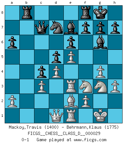 Last move : 0-1 2007 July 8 10:18:55 [Event "FICGS__CHESS__CLASS_D__000029"] [Site "FICGS"] [Date "2007.02.01"] [Round "1"] [White "Mackoy,Travis"] [Black "Behrmann,Klaus"] [Result "0-1"] [WhiteElo "1400"] [BlackElo "1775"] 1.e4 c6 2.d4 d5 3.e5 Bf5 4.Nf3 e6 5.Be2 Ne7 6.O-O Nd7 7.c3 Ng6 8.Re1 Qc7 9.Nbd2 Nf4 10.Bf1 Nd3 11.Re3 Nxc1 12.Rxc1 Be7 13.Qb3 O-O 14.h3 b5 15.Be2 a6 16.Nf1 c5 17.Re1 c4 18.Qd1 b4 19.g4 Bg6 20.Ng3 bxc3 21.bxc3 Rab8 0-1 Caro-Kann : Advance variation Kingside Castling by player White (move 6) Kingside Castling by player Black (move 13) Player Black won this chess game. Follow this game move after move (download)The isolated Pawn casts gloom over the entire chessboard. (Aaron Nimzovich) Du kannst im Schach nur gut werden, wenn du das Spiel liebst. (Robert James Fischer) El Ajedrez es el gimnasio de la mente. (Blaise Pascal) C'est une question de caractère, Beaucoup de gens perdent leur motivation très vite. D'autres, ils sont rares, peuvent la conserver très longtemps. J'aime les échecs, encore aujourd'hui je suis heureux d'analyser des parties. J'aime toujours gagner, je déteste encore perdre. Bien jouer est important pour mon intégrité intellectuelle et morale. Et puis les échecs vivent en ce moment une période historique grâce à Internet. Ils se développent dans les systèmes éducatifs à travers le monde. Ils sortent de leur ghetto, et c'est mon rôle de mener à bien cette révolution. (Gary Kasparov) True nature is revealed in times of difficulty. (Chinese proverb)