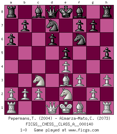 Last move : 1-0 2013 August 24 0:25:44 [Event "FICGS__CHESS__CLASS_A__000140"] [Site "FICGS"] [Date "2013.06.16"] [Round "1"] [White "Pepermans,Toon"] [Black "Almarza-Mato,Carlos"] [Result "1-0"] [WhiteElo "2004"] [BlackElo "2073"] 1.e4 c5 2.Nf3 d6 3.d4 cxd4 4.Nxd4 Nf6 5.Nc3 a6 6.h3 e5 7.Nde2 h5 8.Be3 Nbd7 9.f3 1-0 This chess game has been lost on time (started : 2013.06.16 5:0:11) Sicilian : Najdorf, Adams attack Player White won this chess game. Follow this game move after move (download)What is the difference between chess and football? Everybody understands football, but nobody plays it. Everybody plays chess, but nobody understands it. Everything is relative. (Vladimir Kramnik) Der Freibauer hat für mich eine Seele, genau wie der Mensch, Wünsche, die unerkannt in ihm schlummern, und Befürchtungen, von deren Existenz er selbst kaum ahnt. (Aaron Nimzowitsch) El jugador táctico debe saber que hacer cuando algo se debe de hacer. El estratégico debe saber que hacer cuando nada se debe de hacer. (Savielly Tartakover) On est toujours la mazette de quelqu'un d'autre. (Anonyme) Luck is what you have left over after you give 100 percent. (Langston Coleman)