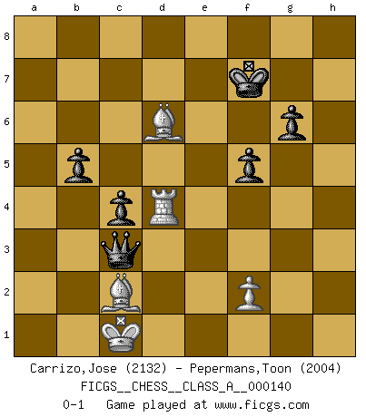 Last move : 0-1 2014 March 19 22:33:59 [Event "FICGS__CHESS__CLASS_A__000140"] [Site "FICGS"] [Date "2013.06.16"] [Round "1"] [White "Carrizo,Jose"] [Black "Pepermans,Toon"] [Result "0-1"] [WhiteElo "2132"] [BlackElo "2004"] 1.e4 e5 2.d4 exd4 3.Qxd4 Nc6 4.Qe3 Nf6 5.Nc3 Bb4 6.Bd2 O-O 7.O-O-O Re8 8.Qg3 Nxe4 9.Nxe4 Rxe4 10.c3 Be7 11.Bd3 Bh4 12.Qf3 Re8 13.Qf4 Ne5 14.Bc2 d6 15.Nf3 Nxf3 16.Qxf3 g6 17.Rhe1 Rxe1 18.Rxe1 Be6 19.Be3 c6 20.g3 Bf6 21.Kb1 Bg7 22.h4 Qa5 23.Bb3 Bf5+ 24.Kc1 Bxc3 25.bxc3 Qxc3+ 26.Kd1 Re8 27.g4 Re4 28.gxf5 Rd4+ 29.Bxd4 Qxf3+ 30.Kc1 Qf4+ 31.Be3 Qxh4 32.fxg6 hxg6 33.Rd1 Qd8 34.Bd4 b6 35.Rh1 Qg5+ 36.Kb1 Kf8 37.Be3 Qf5+ 38.Kc1 c5 39.Rd1 c4 40.Bc2 Qe5 41.Rd4 b5 42.a4 a6 43.axb5 axb5 44.Kd2 Qc5 45.Kc1 Qa3+ 46.Kb1 f5 47.Bf4 Qb4+ 48.Kc1 Qc3 49.Bxd6+ Kf7 0-1 Centre game : Berger variation Kingside Castling by player Black (move 6) Queenside Castling by player White (move 7) Player Black won this chess game. Follow this game move after move (download)The King is a fighting piece. Use it ! (Wilhelm Steinitz) Matt entspricht nicht immer den Tatsachen. (Savielly Grigorievitsch Tartakower) Las piezas de Ajedrez son los bloques del alfabeto que moldean los pensamientos; y esos pensamientos, aunque hagan un diseño visual en el tablero, expresan abstractamente su belleza como un poema. (Marcel Duchamp) Dieu déplace le joueur, et celui-ci la pièce. Quel Dieu derrière Dieu commence donc la trame ? Arturo Perez-Reverte (prix de littérature policière 1993). Do you know these so called Volunteers don't even get paid! (Simpsons)