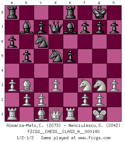 Last move : 1/2-1/2 2013 July 17 15:1:12 [Event "FICGS__CHESS__CLASS_A__000140"] [Site "FICGS"] [Date "2013.06.16"] [Round "1"] [White "Almarza-Mato,Carlos"] [Black "Nenciulescu,Silviu"] [Result "1/2-1/2"] [WhiteElo "2073"] [BlackElo "2042"] 1.e4 e5 2.Nf3 Nc6 3.Bb5 a6 4.Ba4 Nf6 5.O-O Be7 6.Re1 b5 7.Bb3 O-O 8.h3 Bb7 9.d3 d6 10.a3 Qd7 11.Nc3 Rfe8 12.Ne2 d5 13.exd5 Nxd5 14.Ng3 1/2-1/2 Ruy Lopez : Closed, 7...O-O Kingside Castling by player White (move 5) Kingside Castling by player Black (move 7) This chess game ended in a draw. Follow this game move after move (download)We cannot resist the fascination of sacrifice, since a passion for sacrifices is part of a Chessplayer's nature. (Rudolf Spielman) Schach ist das Spiel, das die Verrückten gesund hält. (Albert Einstein) Aquel que ve no otra dirección en el juego que la de dar Jaque Mate a su oponente, nunca será un buen jugador de Ajedrez. (Euwe) Les échecs sont un jeu par leur forme, un art par leur essence et une science par sa difficulté d'acquisition. Ils peuvent vous procurer autant de plaisir qu'un bon livre ou une belle musique, mais vous n'aurez une réelle joie que si vous arrivez à bien jouer. (Tigran Petrosian) Difficult things take a long time, impossible things a little longer. (Author unknown)