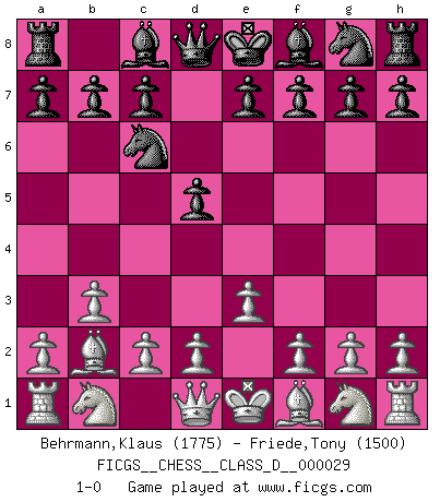 Last move : 1-0 2007 March 15 1:53:2 [Event "FICGS__CHESS__CLASS_D__000029"] [Site "FICGS"] [Date "2007.02.01"] [Round "1"] [White "Behrmann,Klaus"] [Black "Friede,Tony"] [Result "1-0"] [WhiteElo "1775"] [BlackElo "1500"] 1.b3 Nc6 2.Bb2 d5 3.e3 1-0 This chess game has been lost on time (started : 2007.02.01 17:54:59) Nimzovich-Larsen attack Player White won this chess game. Follow this game move after move (download)I am still a victim of Chess. It has all the beauty of art and much more. It cannot be commercialized. Chess is much purer than art in its social position. (Marcel Duchamp) Ich verachte Kasparow. (Viktor Kortschnoi) Fischer deseaba darle a los Rusos una sopa de su propia medicina. (Larry Evans) Shah mat. Le roi est mort. Cri de fierté d'un joueur venant de terrasser son adversaire, courtoisement, sans effusion de sang. The Internet is the world's largest library. It's just that all the books are on the floor. (John Allen Paulos)