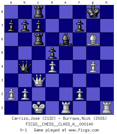 Last move : 0-1 2013 November 27 9:14:56 [Event "FICGS__CHESS__CLASS_A__000140"] [Site "FICGS"] [Date "2013.06.16"] [Round "1"] [White "Carrizo,Jose"] [Black "Burrows,Nick"] [Result "0-1"] [WhiteElo "2132"] [BlackElo "2026"] 1.e4 e5 2.d4 exd4 3.Qxd4 Nc6 4.Qe3 Nf6 5.Nc3 Bb4 6.Bd2 O-O 7.O-O-O Re8 8.Qg3 Nxe4 9.Nxe4 Rxe4 10.c3 Be7 11.Bd3 Bh4 12.Qf3 Re8 13.Qf4 Ne5 14.Bc2 d5 15.Nf3 Nxf3 16.Qxf3 g6 17.g3 Bf6 18.g4 Be6 19.Be3 Qe7 20.h4 Rad8 21.Bd4 Bxd4 22.cxd4 Rd6 23.Rde1 Rb6 24.h5 Qb4 25.Qc3 Rc8 26.hxg6 hxg6 27.Bxg6 Rc6 0-1 Centre game : Berger variation Kingside Castling by player Black (move 6) Queenside Castling by player White (move 7) Player Black won this chess game. Follow this game move after move (download)Chess makes man wiser and clear-sighted. (Vladimir Putin) Rauchen ist dem Schachspieler bei seiner Arbeit, also im Wettkampf, untersagt. (Viktor Kortschnoi) Fischer no está bajo la obligación de nadie. (Joseph Platz) Même si l'adversaire joue le coup analysé précédemment, recommencez l'analyse en voyant la nouvelle position. Première règle de Blumenfeld It is a good thing for an uneducated man to read books of quotations. (Winston Churchill)