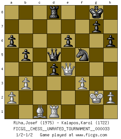 Last move : 1/2-1/2 2013 June 29 14:0:3 [Event "FICGS__CHESS__UNRATED_TOURNAMENT__000033"] [Site "FICGS"] [Date "2013.06.18"] [Round "1"] [White "Riha,Josef"] [Black "Kalapos,Karol"] [Result "1/2-1/2"] [WhiteElo "1975"] [BlackElo "1722"] 1.e4 Nf6 2.e5 Nd5 3.d4 d6 4.c4 Nb6 5.f4 dxe5 6.fxe5 Nc6 7.Be3 Bf5 8.Nf3 e6 9.Nc3 Be7 10.Be2 O-O 11.O-O f6 12.exf6 Bxf6 13.Qd2 Qe7 14.Nb5 Rad8 15.Rad1 Bg4 16.Qc2 a6 17.Nc3 Bxf3 18.Bxf3 Nxc4 19.Bc1 Nxd4 20.Qe4 Nxf3+ 21.gxf3 b5 22.Rxd8 Rxd8 23.Re1 Qd7 24.Rd1 Bd4+ 25.Kg2 c5 26.Ne2 Nd6 27.Qg4 Nf5 28.Nxd4 cxd4 29.Qe4 Qd5 30.b3 h6 1/2-1/2 Alekhine's defense : Four pawns attack, 7.Be3 Kingside Castling by player Black (move 10) Kingside Castling by player White (move 11) This chess game ended in a draw. Follow this game move after move (download)A thorough understanding of the typical mating continuations makes the most complicated sacrificial combinations leading up to them not only not difficult, but almost a matter of course. (Siegbert Tarrasch) Ich habe Putins Aufstieg an die Macht beobachtet und seine Politik, die demokratischen Institutionen meines Landes zu zerstören. (Garry Kasparov) El Ajedrez es un juego de pelea el cual es puramente intelectual e incluye la suerte. (Richard Reti) Celui qui prend des risques peut perdre, celui qui n'en prend pas perd toujours. (Xavier Tartacover) Quotation,n.: The act of repeating erroneously the words of another. The words erroneously repeated. (Ambrose Bierce, The Devil's Dictionary)
