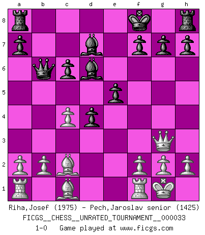 Last move : 1-0 2013 September 10 1:34:58 [Event "FICGS__CHESS__UNRATED_TOURNAMENT__000033"] [Site "FICGS"] [Date "2013.06.18"] [Round "1"] [White "Riha,Josef"] [Black "Pech,Jaroslav senior"] [Result "1-0"] [WhiteElo "1975"] [BlackElo "1425"] 1.d4 Nf6 2.e4 Nxe4 3.Bd3 d5 4.Nf3 c5 5.O-O Nc6 6.Nbd2 Nxd2 7.Qxd2 cxd4 8.Bb5 Qb6 9.Nxd4 e5 10.Nxc6 bxc6 11.Ba4 Bd7 12.c4 d4 13.Qd3 Bd6 14.Qg3 Kf8 15.Bc2 1-0 This chess game has been lost on time (started : 2013.06.18 0:19:21) Queen's pawn game Kingside Castling by player White (move 5) Player White won this chess game. Follow this game move after move (download)If a ruler does not understand Chess, how can he rule over a kingdom ? (King Khusros II) Der vorletzte Fehler gewinnt. (Savielly Grigorievitsch Tartakower) En la perfecta combinación de Ajedrez como en una historia corta de primera clase, toda la trama y contra trama deberá conducir hacia un final sorprendente, el interes no es mitigado hasta el último momento. (Yates and Winter) D'abord les bases : Jouez et étudiez, puis étudiez et jouez, ensuite jouez et étudiez, puis étudiez et jouez. Deuxièmement : Donnez toujours le meilleur de vous-même ! (Ken Smith) Computers have lots of memory but no imagination. (Anonymous)