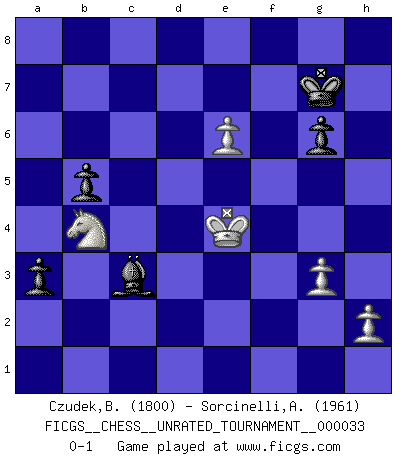 Last move : 0-1 2013 October 27 0:17:33 [Event "FICGS__CHESS__UNRATED_TOURNAMENT__000033"] [Site "FICGS"] [Date "2013.06.18"] [Round "1"] [White "Czudek,Bohuslav"] [Black "Sorcinelli,Andrea"] [Result "0-1"] [WhiteElo "1800"] [BlackElo "1961"] 1.d4 Nf6 2.c4 g6 3.Nc3 d5 4.cxd5 Nxd5 5.e4 Nxc3 6.bxc3 Bg7 7.Bc4 c5 8.Ne2 Nc6 9.Be3 O-O 10.O-O b6 11.Rc1 Bb7 12.d5 Ne5 13.Bb3 c4 14.Bc2 e6 15.dxe6 Nd3 16.Bxd3 cxd3 17.exf7+ Rxf7 18.Ng3 Rc8 19.f4 Rfc7 20.f5 Rxc3 21.Rxc3 Rxc3 22.Qf3 d2 23.fxg6 hxg6 24.Qf7+ Kh8 25.Bxd2 Qxd2 26.Qxb7 Rc1 27.Qd5 Rc2 28.Qa8+ Kh7 29.e5 Qd4+ 30.Kh1 Rxa2 31.e6 Ra1 32.Qf3 Rxf1+ 33.Qxf1 Qe5 34.Qf7 Qa1+ 35.Nf1 Qf6 36.Qxf6 Bxf6 37.Ne3 Kg7 38.Nd5 Be5 39.g3 b5 40.Kg2 a5 41.Kf3 a4 42.Ke4 a3 43.Nb4 Bc3 0-1 King's Indian defense, 3.Nc3 Kingside Castling by player Black (move 9) Kingside Castling by player White (move 10) 10 pieces endgame at move 36 : White KNPPP , Black KBPPP WHITE : King + 1 Knight 3 Pawns BLACK : King + 1 Bishop 3 Pawns Player Black won this chess game. Follow this game move after move (download)In Chess, at least, the brave inherit the earth. (Edmar Mednis) Je älter ich werde, um so mehr schätze ich die Bauern. (Paul Keres) Nunca nadie ha ganado una partida de Ajedrez rindiendose. (Unknown) Ce qui caractérise les parties de combat, c'est que si le défenseur a constamment de difficiles problèmes à résoudre, l'attaquant doit chercher sans relâche de nouvelles possibilités d'attaque. (Koblentz) Man with more than one clock never knows what time it is. (Chinese thought)