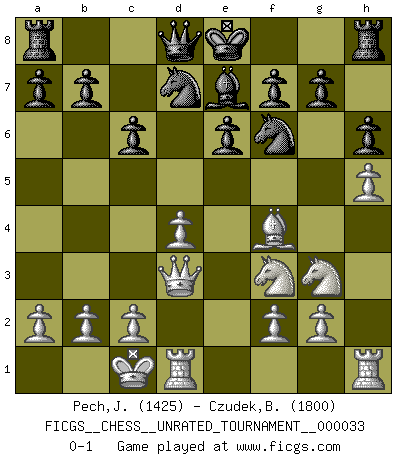 Last move : 0-1 2013 September 10 14:0:49 [Event "FICGS__CHESS__UNRATED_TOURNAMENT__000033"] [Site "FICGS"] [Date "2013.06.18"] [Round "1"] [White "Pech,Jaroslav senior"] [Black "Czudek,Bohuslav"] [Result "0-1"] [WhiteElo "1425"] [BlackElo "1800"] 1.e4 c6 2.d4 d5 3.Nc3 dxe4 4.Nxe4 Bf5 5.Ng3 Bg6 6.h4 h6 7.Nf3 Nd7 8.h5 Bh7 9.Bd3 Bxd3 10.Qxd3 e6 11.Bf4 Ngf6 12.O-O-O Be7 0-1 Caro-Kann : Classical, 7...Nd7 Queenside Castling by player White (move 12) Player Black won this chess game. Follow this game move after move (download)As one by one I mowed them down, my superiority soon became apparent. (Jose Capablanca) Ihnen, Herr Lasker, habe ich nur drei Worte zu sagen: Schach und matt. (Siegbert Tarrasch) El Ajedrez es el arte del análisis. (Mikhail Botvinnik) On n'a jamais que l'âge auquel on a commence à jouer aux échecs car après on cesse de vieillir. (Capablanca) You must do what you feel is right... of course. (Obi-Wan Kenobi in Star Wars ep.4)