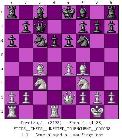 Last move : 1-0 2013 September 4 1:17:12 [Event "FICGS__CHESS__UNRATED_TOURNAMENT__000033"] [Site "FICGS"] [Date "2013.06.18"] [Round "1"] [White "Carrizo,Jose"] [Black "Pech,Jaroslav senior"] [Result "1-0"] [WhiteElo "2132"] [BlackElo "1425"] 1.e4 c5 2.d4 cxd4 3.c3 dxc3 4.Nxc3 Nc6 5.Nf3 d6 6.Bc4 e6 7.O-O Nf6 8.Qe2 a6 9.Rd1 Qc7 10.Bf4 1-0 This chess game has been lost on time (started : 2013.06.18 0:19:21) Sicilian : Smith-Morra gambit Kingside Castling by player White (move 7) Player White won this chess game. Follow this game move after move (download)When I asked Fischer why he had not played a certain move in our game, he replied: 'Well, you laughed when I wrote it down !' (Mikhail Tal) Ich spiele ehrlich und spiele, um zu gewinnen. Wenn ich verliere nehme ich meine Medizin. (Robert James Fischer) Los asuntos humanos son como una partida de Ajedrez: solo aquellos que no lo toman seriamente, pueden ser llamados buenos jugadores. (Hung Tzu Ch'eng) La menace est plus forte que l'exécution. (Aaron Nimzovitch) There is a computer disease that anybody who works with computers knows about. It's a very serious disease and it interferes completely with the work. The trouble with computers is that you 'play' with them ! (Richard P. Feynman)