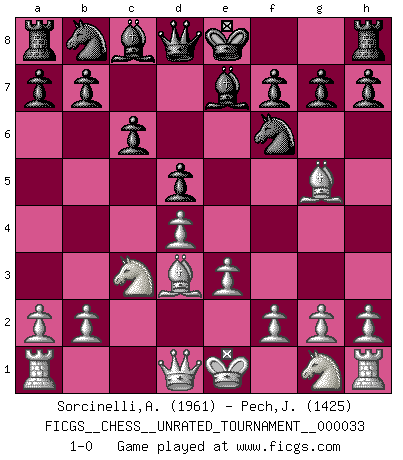Last move : 1-0 2013 September 6 1:23:29 [Event "FICGS__CHESS__UNRATED_TOURNAMENT__000033"] [Site "FICGS"] [Date "2013.06.18"] [Round "1"] [White "Sorcinelli,Andrea"] [Black "Pech,Jaroslav senior"] [Result "1-0"] [WhiteElo "1961"] [BlackElo "1425"] 1.d4 d5 2.c4 e6 3.Nc3 Nf6 4.cxd5 exd5 5.Bg5 c6 6.e3 Be7 7.Bd3 1-0 This chess game has been lost on time (started : 2013.06.18 0:19:21) QGD : Exchange, positional line, 5...c6 Player White won this chess game. Follow this game move after move (download)By playing at Chess then, we may learn: First: Foresight... Second: Circumspection... Third: Caution... And lastly, we learn by Chess the habit of not being discouraged by present bad appearances in the state of our affairs, the habit of hoping for a favorable chance, and that of persevering in the secrets of resources. (Benjamin Franklin) Die Partien sind immer verschieden, die Interviews immer die gleichen. (Garry Kasparov) El hombre es un frívolo, una creatura engañosa y como un jugador de Ajedrez, se preocupa mas por el proceso de obtener su meta que de la meta por sí misma. (Dostoyevsky) Nous vivons dans un monde échiquéen : chaque jour qui passe est un défi à relever. (Philosophe Sasha) I'm extremely disappointed. I send you out for exciting, new designer drugs, you come back with tomato sauce. (Gregory House, House M.D.)