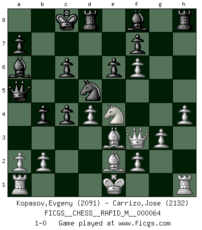 Last move : 1-0 2013 October 1 15:7:18 [Event "FICGS__CHESS__RAPID_M__000064"] [Site "FICGS"] [Date "2013.06.18"] [Round "1"] [White "Kopasov,Evgeny"] [Black "Carrizo,Jose"] [Result "1-0"] [WhiteElo "2091"] [BlackElo "2132"] 1.d4 d5 2.c4 e6 3.Nc3 c6 4.Nf3 Nf6 5.Bg5 dxc4 6.e4 b5 7.e5 h6 8.Bh4 g5 9.Nxg5 hxg5 10.Bxg5 Nbd7 11.exf6 Qa5 12.g3 b4 13.Ne4 Ba6 14.Qf3 O-O-O 15.h4 Nb6 16.Be3 Nd5 17.Be2 1-0 This chess game has been lost on time (started : 2013.06.18 14:56:41) QGD : Semi-Slav Queenside Castling by player Black (move 14) Player White won this chess game. Follow this game move after move (download)In a gambit you give up a Pawn for the sake of getting a lost game. (Samuel Standige Boden) Der Umstand, daß uns eine 7 Stunden Zeitkontrolle ermöglicht eine großartige, tiefe Partie zu spielen, ist für die Massenmedien nicht weiter von Bedeutung. (Alexej Shirov) Tu eres para mi la Reina en d8 y yo soy el Peón en d7!!. (GM Eduard Gufeld) Le temps de noter son nom sur la feuille de partie, j'étais déjà en zeitnot ! D'un modeste amateur apparié lors de la première ronde d'un open contre le grand-maître Azmaïparashvili. I don't diet. I just don't eat as much as I'd like to. (Linda Evangelista, supermodel)
