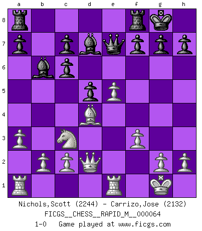 Last move : 1-0 2013 August 10 5:55:15 [Event "FICGS__CHESS__RAPID_M__000064"] [Site "FICGS"] [Date "2013.06.18"] [Round "1"] [White "Nichols,Scott"] [Black "Carrizo,Jose"] [Result "1-0"] [WhiteElo "2244"] [BlackElo "2132"] 1.e4 e5 2.Nf3 Nc6 3.Bc4 Nf6 4.d4 exd4 5.e5 d5 6.Bb5 Ne4 7.Nxd4 Bd7 8.Bxc6 bxc6 9.O-O Bc5 10.f3 Ng5 11.Be3 Bb6 12.Nc3 Ne6 13.Qd2 Nxd4 14.Bxd4 Qe7 15.a3 O-O 16.Rfe1 1-0 This chess game has been lost on time (started : 2013.06.18 14:56:41) Two knights defense Kingside Castling by player White (move 9) Kingside Castling by player Black (move 15) Player White won this chess game. Follow this game move after move (download)Bobby Fischer's current state of mind is indeed a tragedy. One of the world's greatest Chess players - the pride and sorrow of American Chess. (Frank Brady) Je älter ich werde, um so mehr schätze ich die Bauern. (Paul Keres) Nunca nadie ha ganado una partida de Ajedrez rindiendose. (Unknown) Les ravages du H expliquent la différence de niveau entre Tal et Thal [Abergel]. The difference between perseverance and obstinacy is that one comes from a strong will, and the other from a strong won't. (Henry Ward Beecher)
