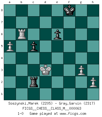 Last move : 1-0 2013 December 3 9:58:14 [Event "FICGS__CHESS__CLASS_M__000063"] [Site "FICGS"] [Date "2013.06.19"] [Round "1"] [White "Soszynski,Marek"] [Black "Gray,Garvin"] [Result "1-0"] [WhiteElo "2205"] [BlackElo "2317"] 1.d4 d5 2.c4 c6 3.Nf3 Nf6 4.Nc3 e6 5.Bg5 dxc4 6.e4 b5 7.e5 h6 8.Bh4 g5 9.Nxg5 hxg5 10.Bxg5 Nbd7 11.exf6 Bb7 12.g3 c5 13.d5 Bh6 14.Bxh6 Rxh6 15.Qd2 Rg6 16.O-O-O Nxf6 17.Nxb5 Bxd5 18.Rg1 Ke7 19.Nc3 Qb6 20.Qe3 Kf8 21.Be2 Bc6 22.Qe5 Nd7 23.Qh8+ Ke7 24.Qh4+ Nf6 25.Rd2 Kf8 26.Rgd1 Re8 27.Qxc4 Qb4 28.Qa6 Qb6 29.Qxb6 axb6 30.Rd6 Rc8 31.Nb5 Bxb5 32.Bxb5 Rb8 33.Rd8+ Rxd8 34.Rxd8+ Ke7 35.Rb8 Nd5 36.Rb7+ Kf8 37.Kd2 f5 38.Bc4 f4 39.a4 fxg3 40.fxg3 Rg4 41.b3 Rd4+ 42.Ke2 Nc3+ 43.Kf3 Ne4 44.Rxb6 Nd2+ 45.Ke2 Nxc4 46.bxc4 Rxc4 47.a5 Rc2+ 48.Kd3 1-0 Alvin Alcala Garvin, were is lady luck this time? :( QGD Slav : 4.Nc3 Queenside Castling by player White (move 16) 10 pieces endgame at move 46 : White KRPPPP , Black KRPP WHITE : King + 1 Rook 4 Pawns BLACK : King + 1 Rook 2 Pawns 9 pieces endgame at move 46 : White KRPPP , Black KRPP WHITE : King + 1 Rook 3 Pawns BLACK : King + 1 Rook 2 Pawns Player White won this chess game. Follow this game move after move (download)It is no time to be playing Chess when the house is on fire. (Italian Proverb) Taktik ist was man tun muß, wenn etwas zu tun ist. Strategie ist was man tun muß, wenn nichts zu tun ist. (Savielly Grigorievitsch Tartakower) Desconfianza es la característica mas necesaria de un jugador de Ajedrez. (Siegbert Tarrasch) Les Echecs ne sont pas pour les âmes timides. Ils requièrent un homme entier, qui ne s'arrête pas aveuglément à ce qui a été déjà établi, mais qui tente individuellement de sonder les profondeurs du jeu. (W. Steinitz) You can only get smarter by playing a smarter opponent. (Revolver, movie)